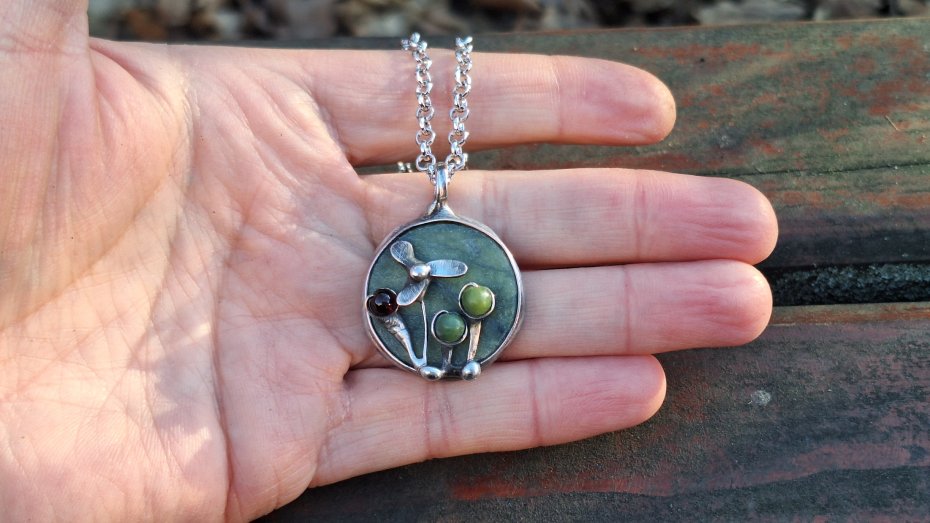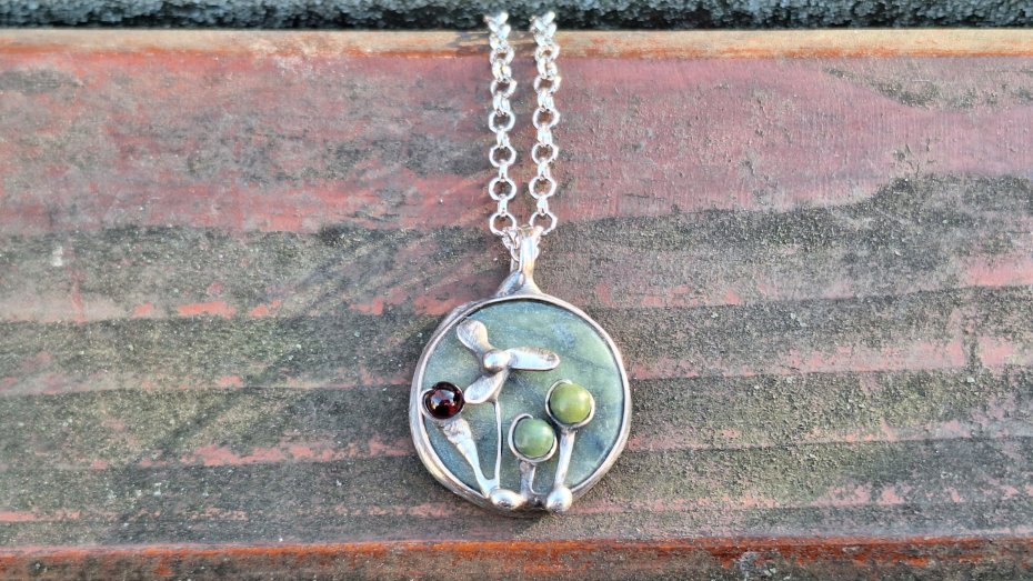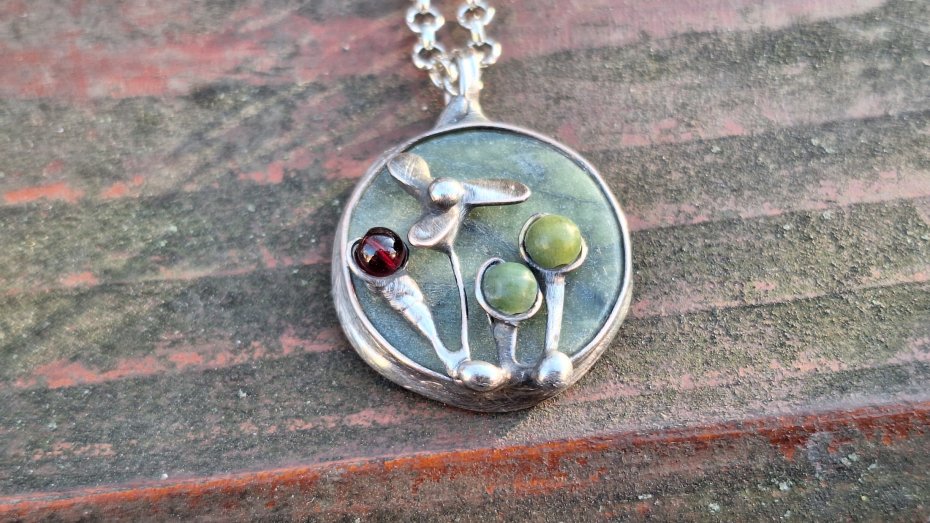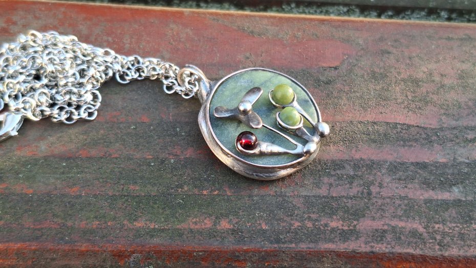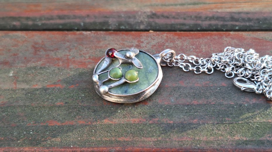 Wisiorek wykonany z miedzi, cyny, jadeitu, nefrytów i granatu. Wymiary ok. 2.5 na 2.5 cm. Zawieszony na łańcuszku o długości ok. 50 cm.