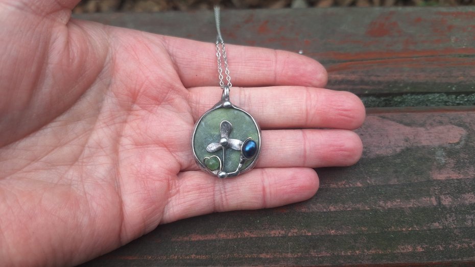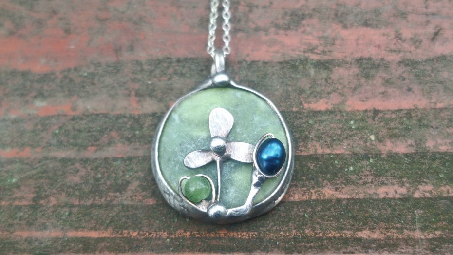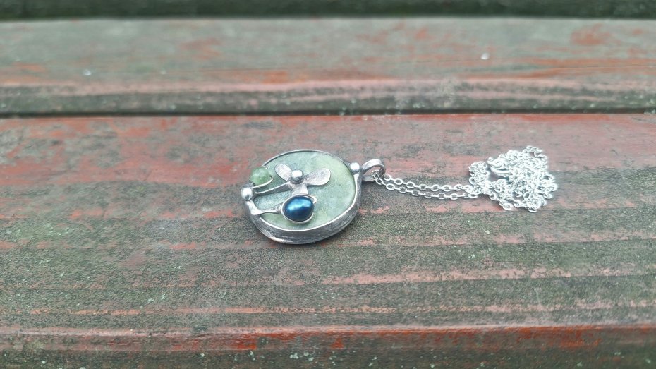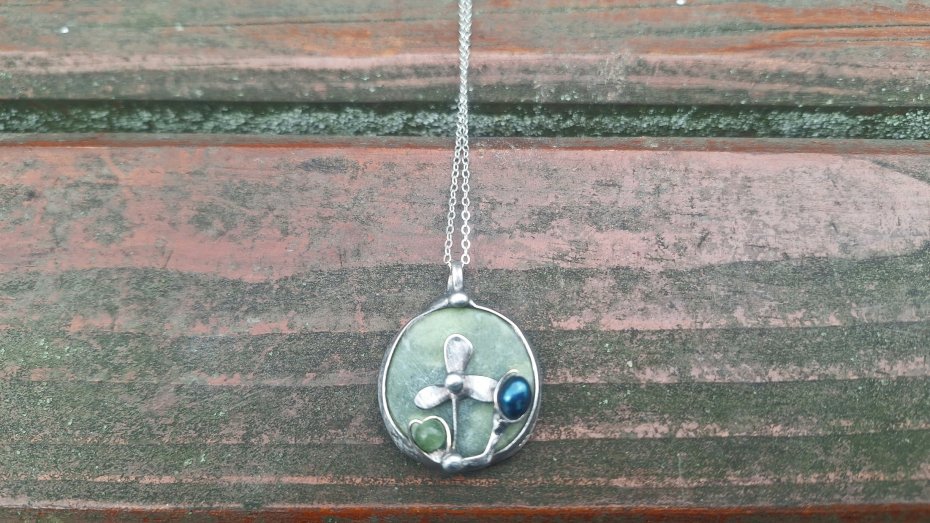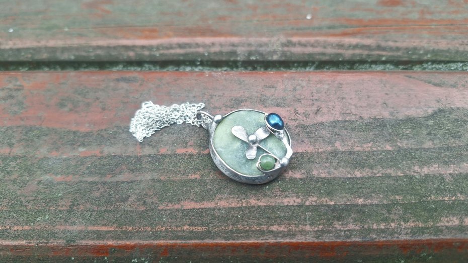 Wisiorek wykonany z miedzi, cyny, jadeitu, nefrytu i perły. Wymiary ok. 2.5 na 2.5 cm. Zawieszony na łańcuszku o długości ok. 50 cm.