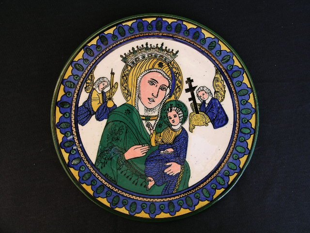 Bardzo ciekawy, OGROMNY ceramiczny TALERZ - PATERA - OBRAZ do powieszenia. Jak święty medalion :) W całości ręcznie malowany i kolorowany, w estetyce ludowych ikon na szkle malowanych. Ciepłe skojarzenia z tzw. ludową sztuką naiwną :) Ciekawy autentyzm kolorystyki. Płaski, na błyszcząco szkliwiony. Z charakterystycznym nakrapianiem. Godnością Autora sygnowany na szacie Madonny - Kafra(MW?). Od spodu także szkliwiony, z dziurkami do powieszenia. Wyjątkowy i artystyczny. 27,5 x 1,5 cm. Stan zachowania bardzo dobry.