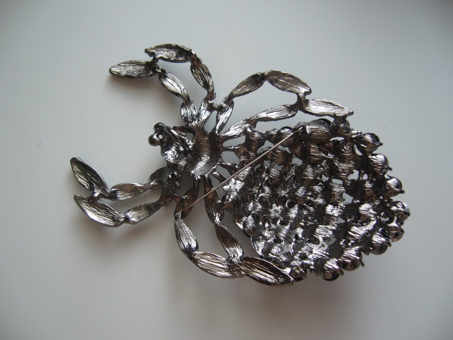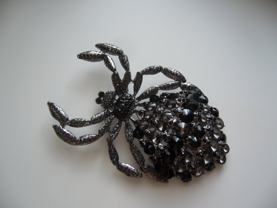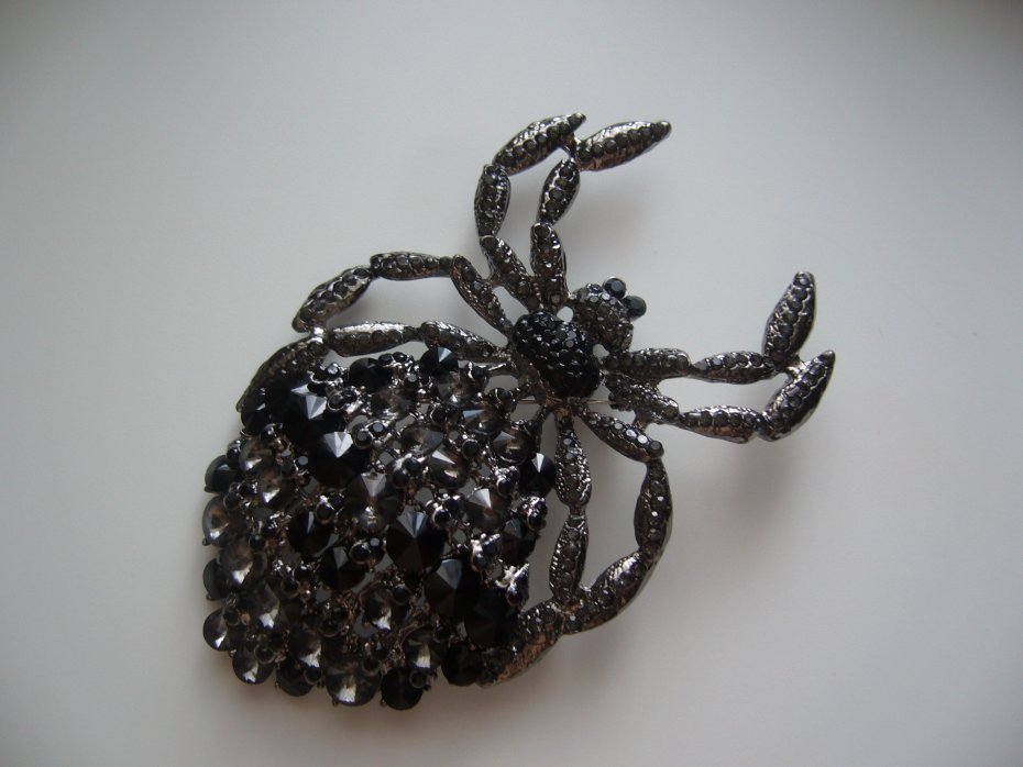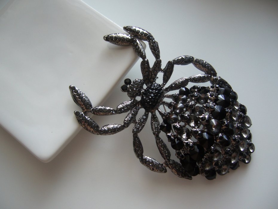 PIĘKNA POSREBRZANA OGROMNA BROSZKA WISIOR PAJĄK, ZDOBIONA KRYSZTAŁKAMI W KOLORZE CZARNYM I SZARYM