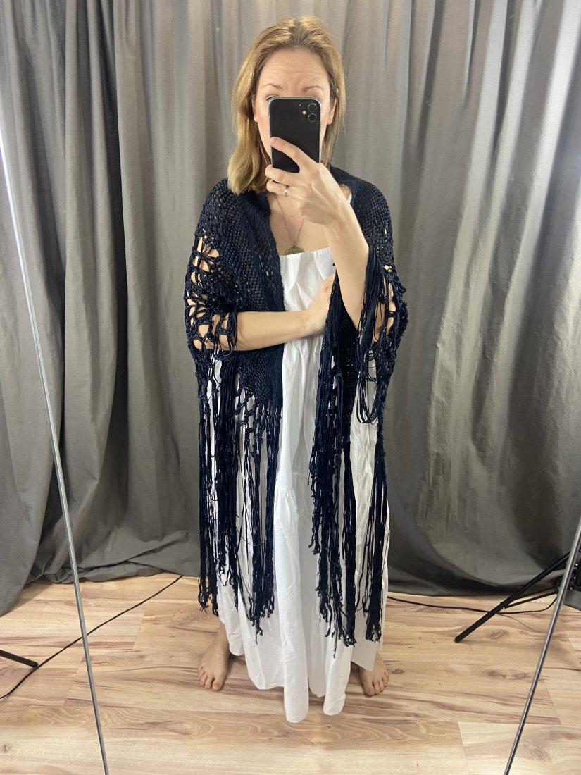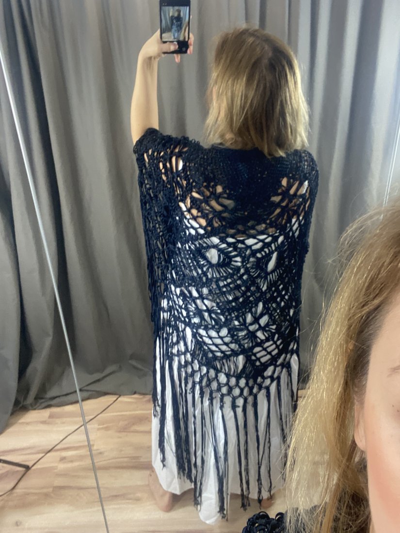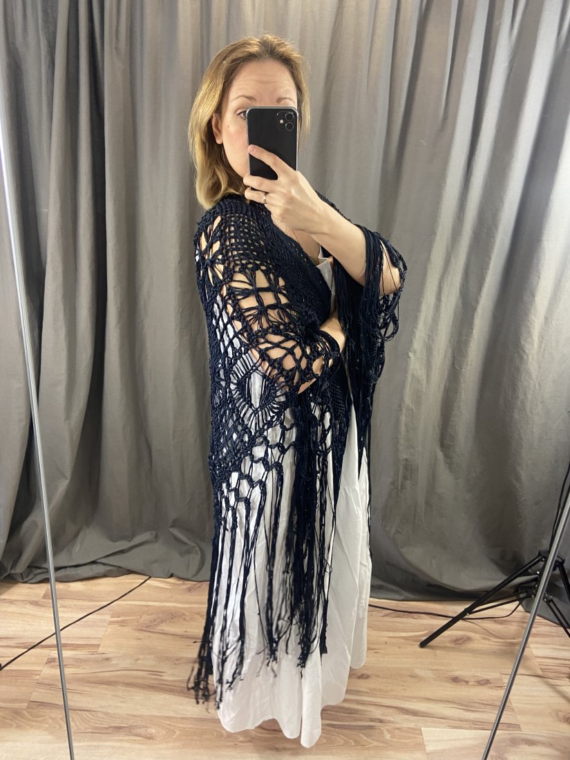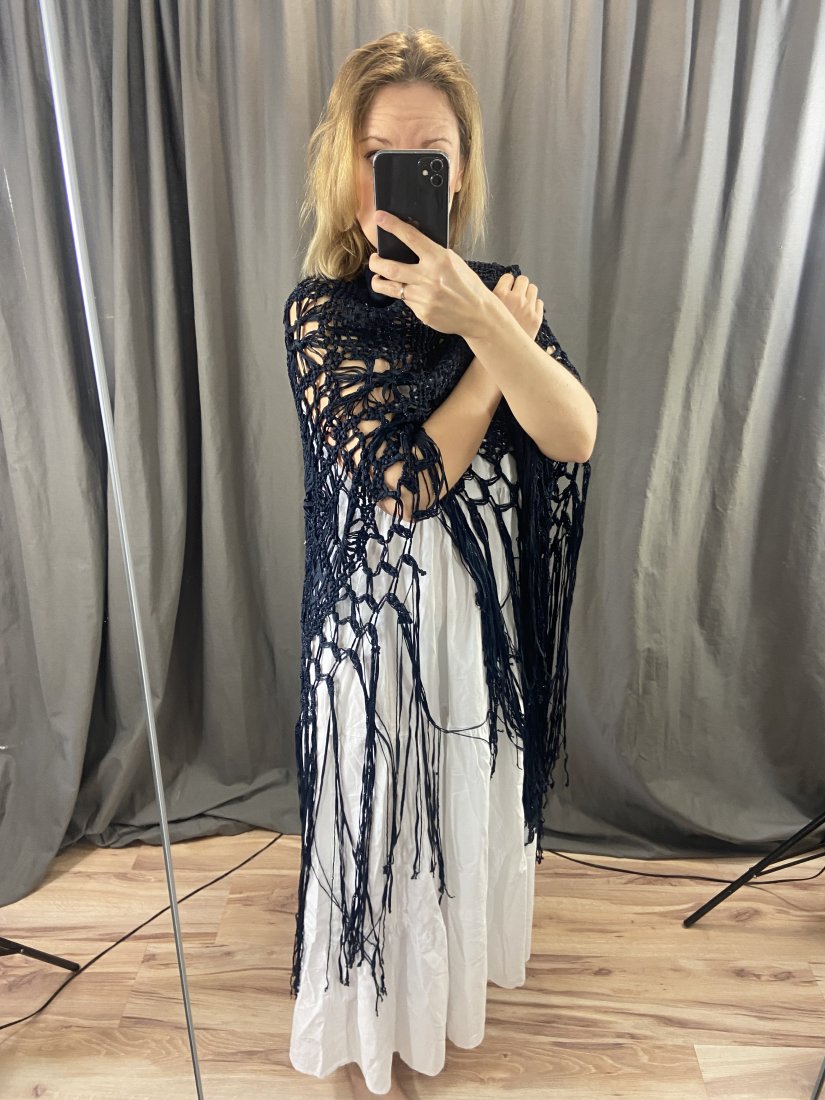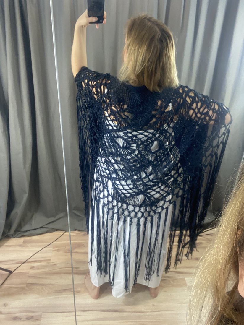 Ogromna ręcznie upleciona chusta ze sznureczków z górą zrobioną na drutach.