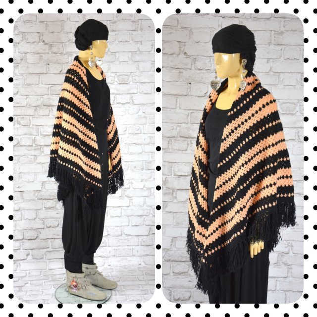 Ogromna ciepła chusta , ponczo o trójkątnym kształcie, chusta wykonana z grubszej ciepłej tkaniny ( jak grubsze sweterki). Dwu kolorowa ; czarno- łososiowa(jaśniejszy łososiowy kolor)- wykończona frędzlami.