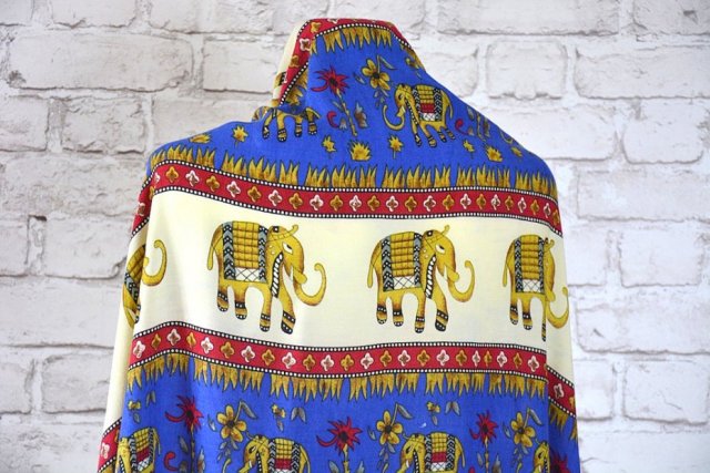 Przepiękna, ogromna chusta, narzutka w orietalnym stylu w printy słoni , wykończona frędzlami. Chusta w kolorach błękitu, czerwieni, bieli, beżu, wykonana z przyjemnej viskozy. W okresie letnim doskonale się sprawdzi również np jako pareo.Wymiary: 138/114 .
