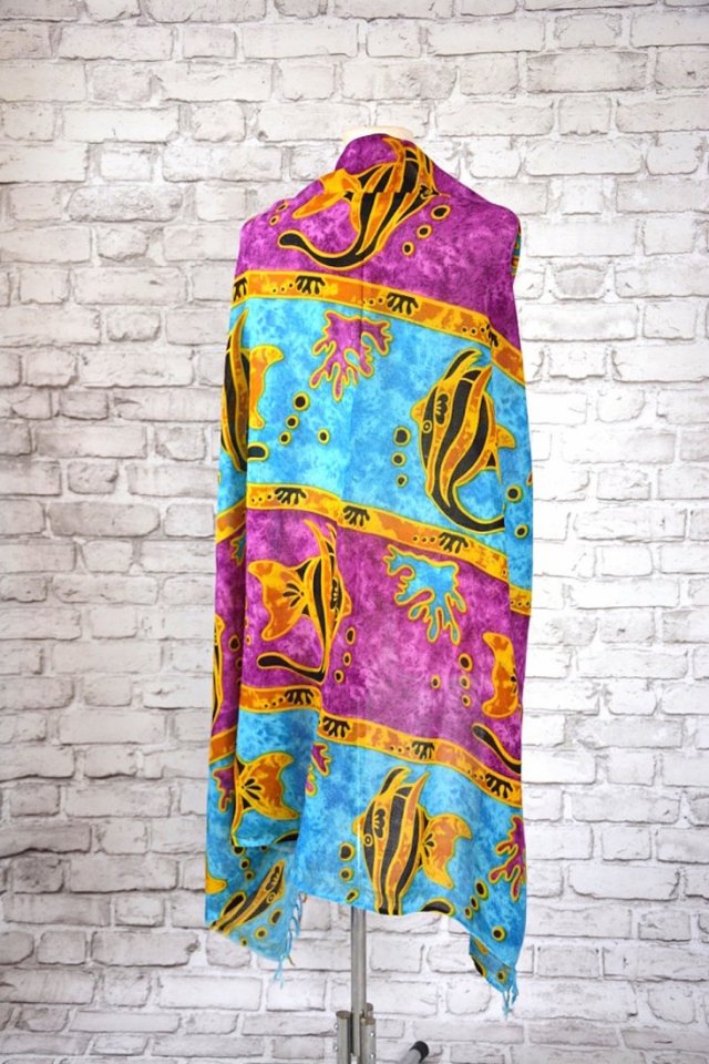 Piękna, szalenie kolorowa bardzo duża chusta w stylu boho we wzory rybek, wykończona frędzelkami,dzięki dużym gabarytom świetnie się sprawdzi noszona również jako narzutka.Wymiary :164 x 113