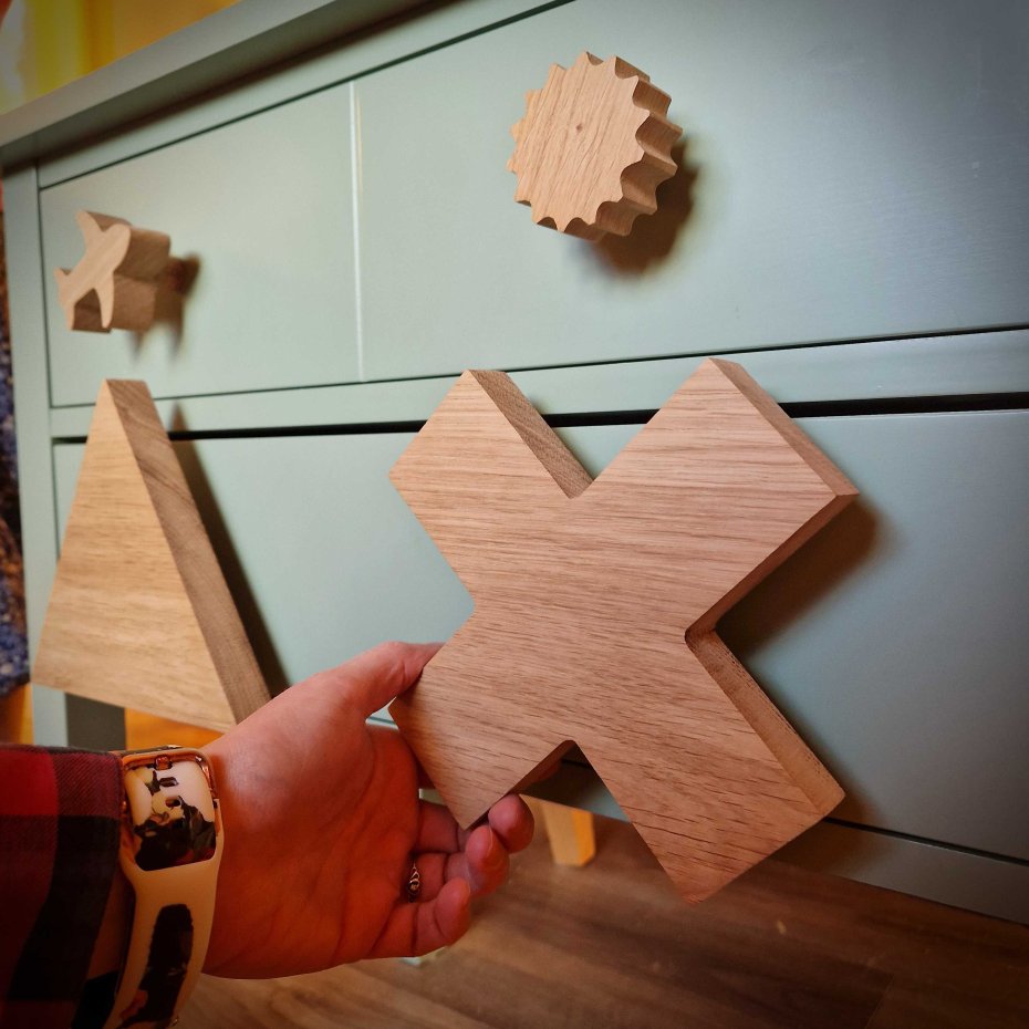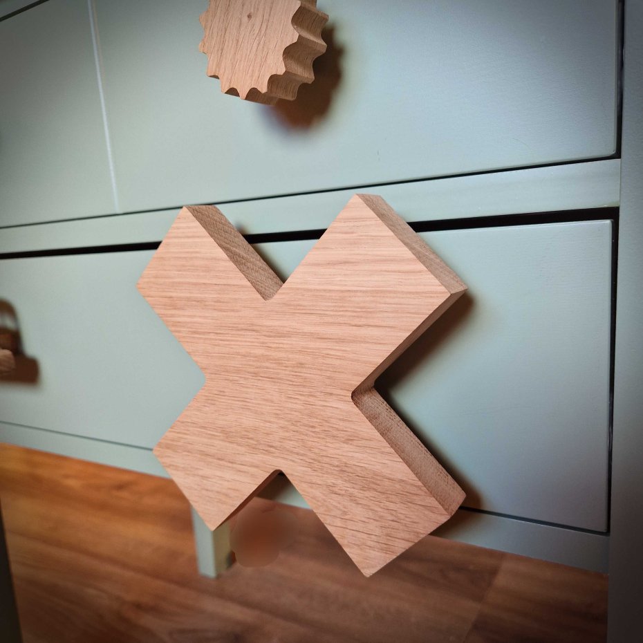 Solidna, trwała i wykonana z dbałością o każdy szczegół – idealnie sprawdzi się przy większych frontach, drzwiach, komodach czy zabudowach, gdzie klasyczna gałka byłaby zbyt mała. Na zdjęciach pokazano wzory trójkąta i znaku X, które efektownie prezentują format i kontrastują z naszymi standardowymi modelami – aż trzykrotnie mniejszymi.