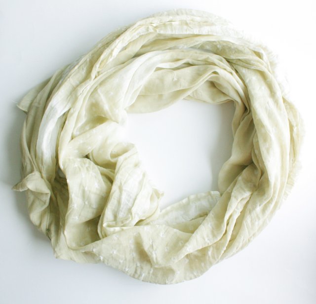 Wielki szal, którym można owinąć się wiele razy lub narzucić go na ramiona. Kolor to mocna spłowiała limonka przechodząca w beż w drobny wzorek eru. Materiał to prawdopodobnie wiskoza.