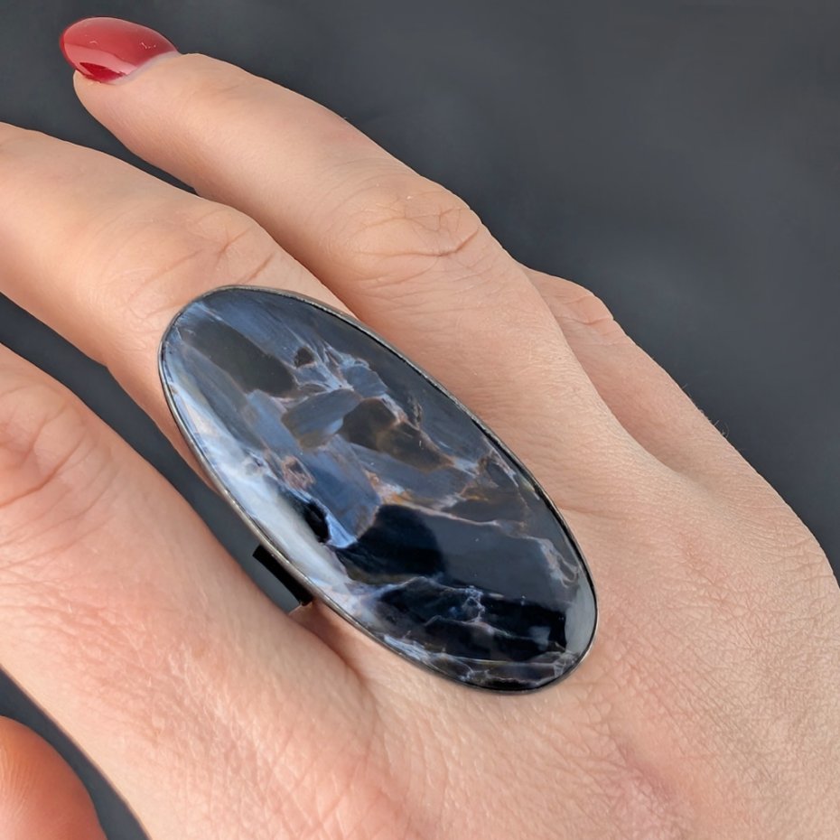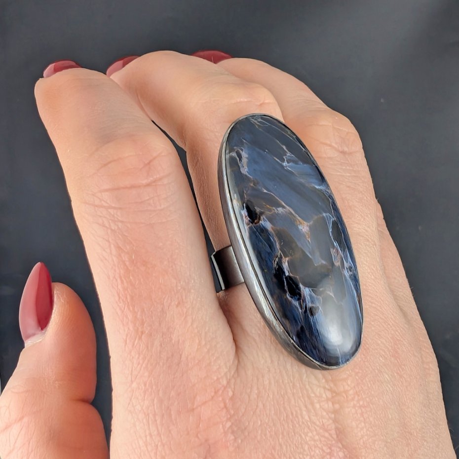 Pierścień wykonany z oksydowanego srebra próby 925 oraz ogromnego, naturalnego pietersitu (pietersite). Niezwykły minerał.Wspaniały efekt włókien mieniących się podczas ruchu, niczym ruchome piaski czy wodospady. Petersit ukazuje efekt kociego oka, strukturą przypomina nieco czaroit. Rzadki bardzo jakościowy minerał. Wymiary oprawy 45 x 20 mm. Rozmiar jubilerski 19, mogę powiększyć na rozmiar max.21. Obrączka ma 6 mm szerokości. Waga 16,3 g. Pierścień wysyłamy w ozdobnym pudełeczku.