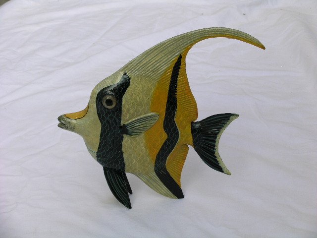 Duuuża rzeżba-dekoracja z bardzo lekkiej masy,a może to drewno jest ? Artystycznie ręcznie i bardzo precyzyjnie w rybią urodę malowana :) Oczy jak żywe, tzn. jak u ryby... Na błyszcząco szkliwiona. Stojąca lub leżąca. Fantastycznie dekoracyjna. 20,5 x 23 x 3,5 cm. Stan zachowania bardzo dobry minus drobne ślady użytkowania. Doskonała dekoracja łazienki i nie tylko. Duży i lekki.