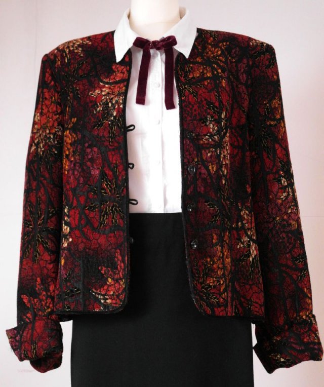 Oryginalny żakiet w rozm.z metki 46.Piękne kolory bordo złoto rdzawo czerwone przeplatane czarnymi gałązkami. Tkanina gobelinowa, ale miękka i miła w dotyku. Na podszewce, z delikatnymi poduszkami. Zapinany na guziczki.