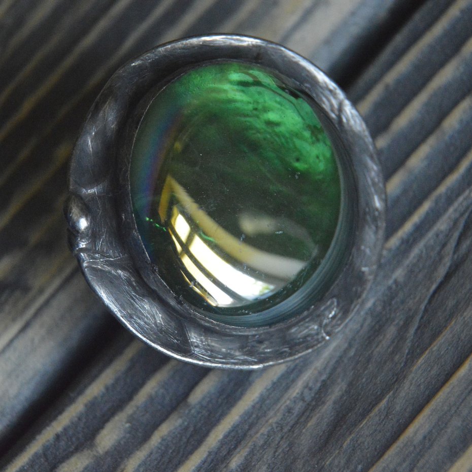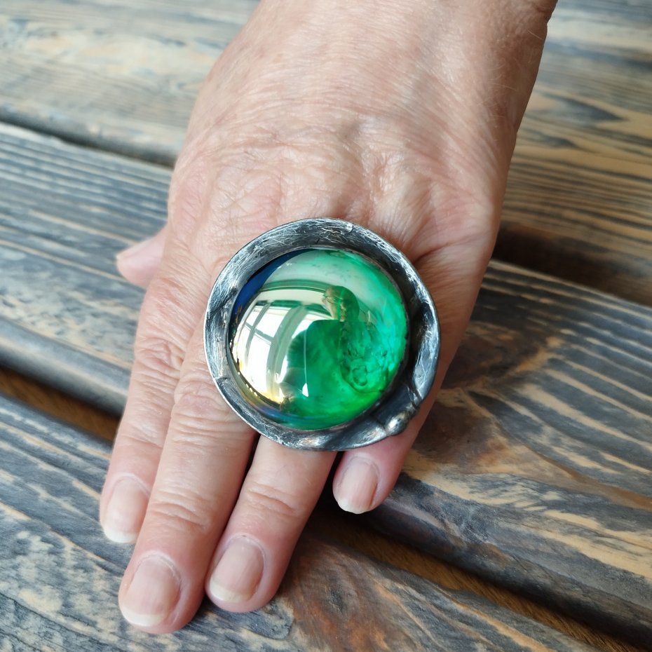 Duży masywny artystyczny pierścionek wykonany z zielono szmaragdowego kaboszonu oprawionego stopem cyny na miedzianej bazie. Średnica pierścionka to ok. 4.5 cm , całość stylizowana na stare srebro i ręcznie polerowana. Pierścionek posiada regulowaną obrączkę Zapraszam do zakupu.