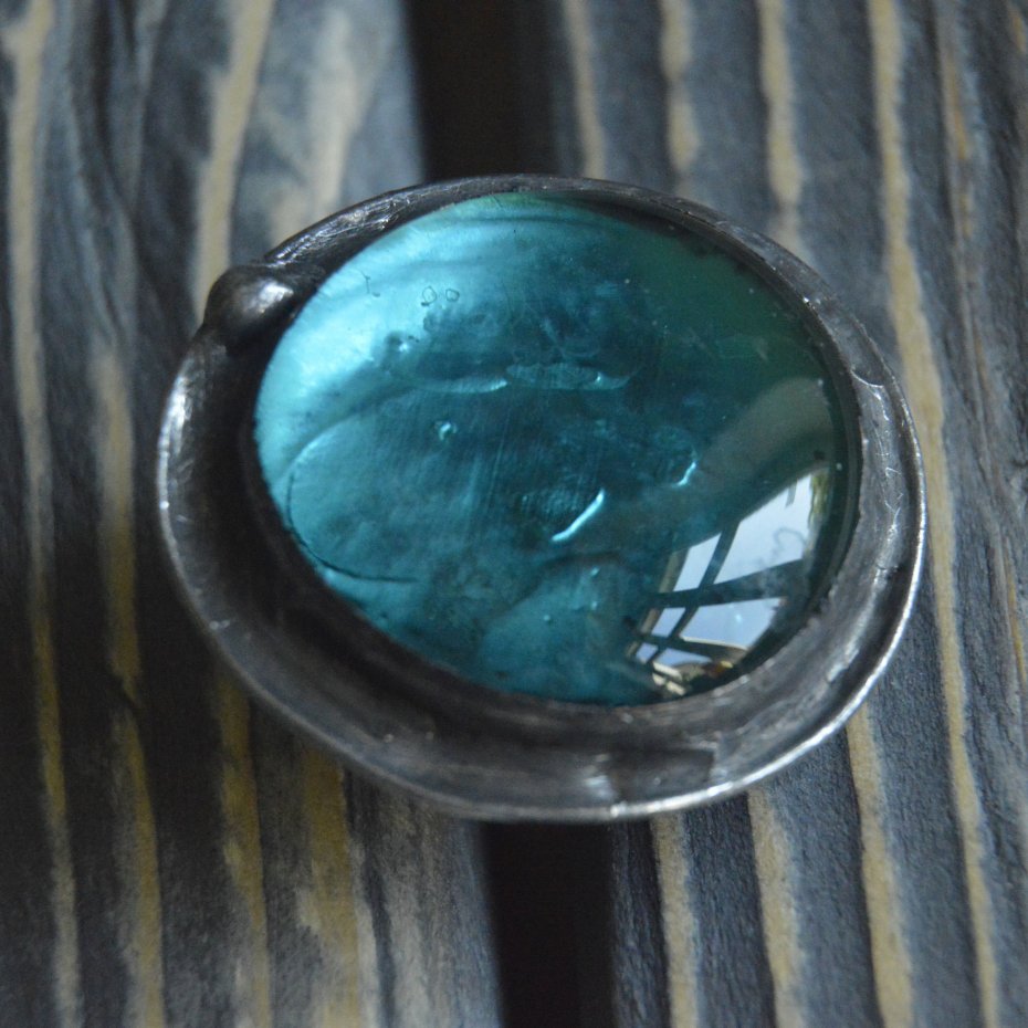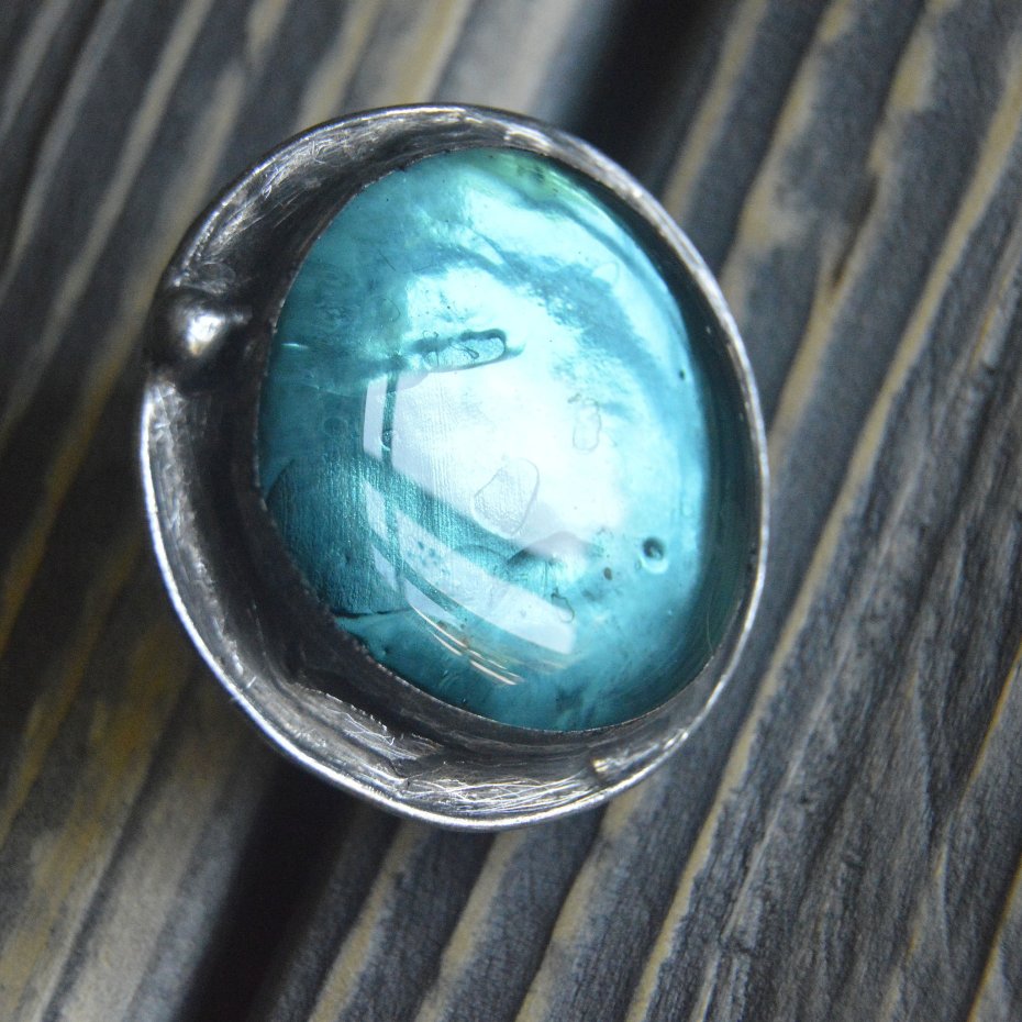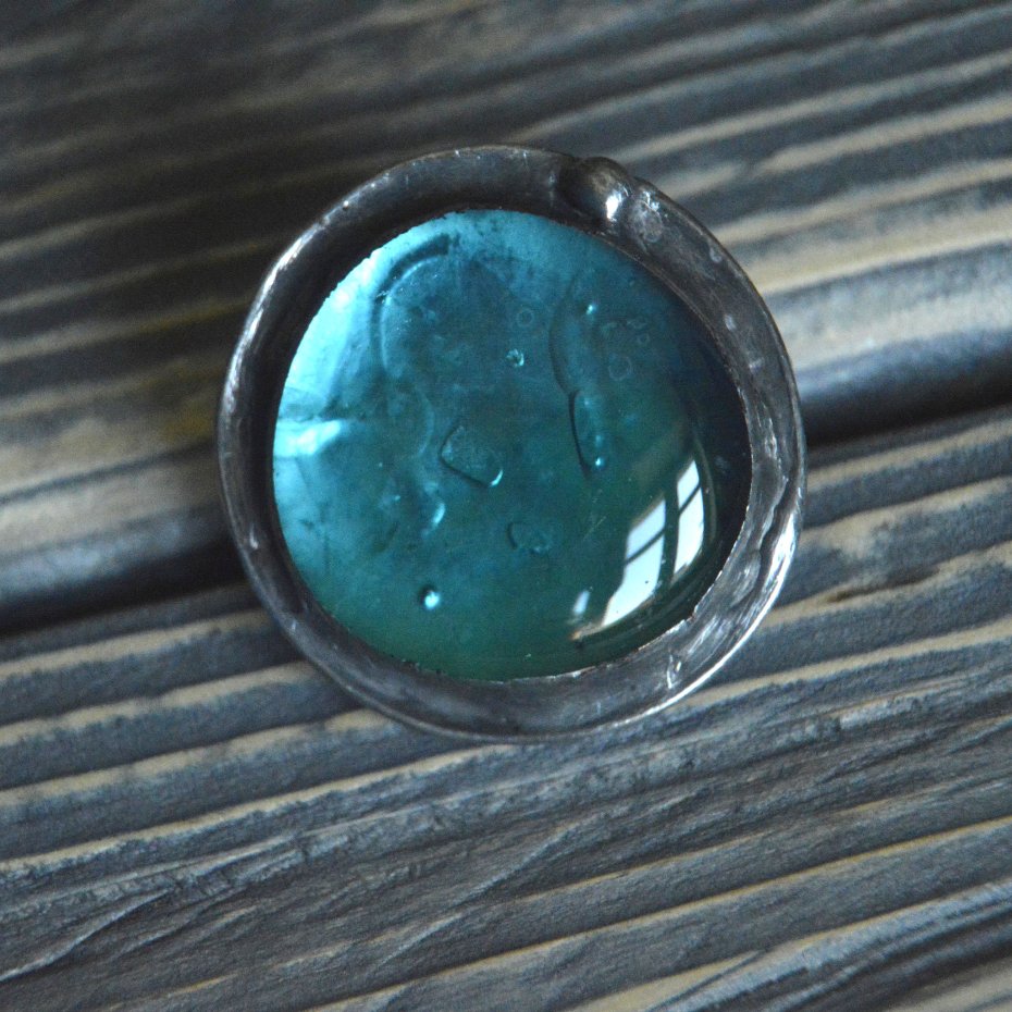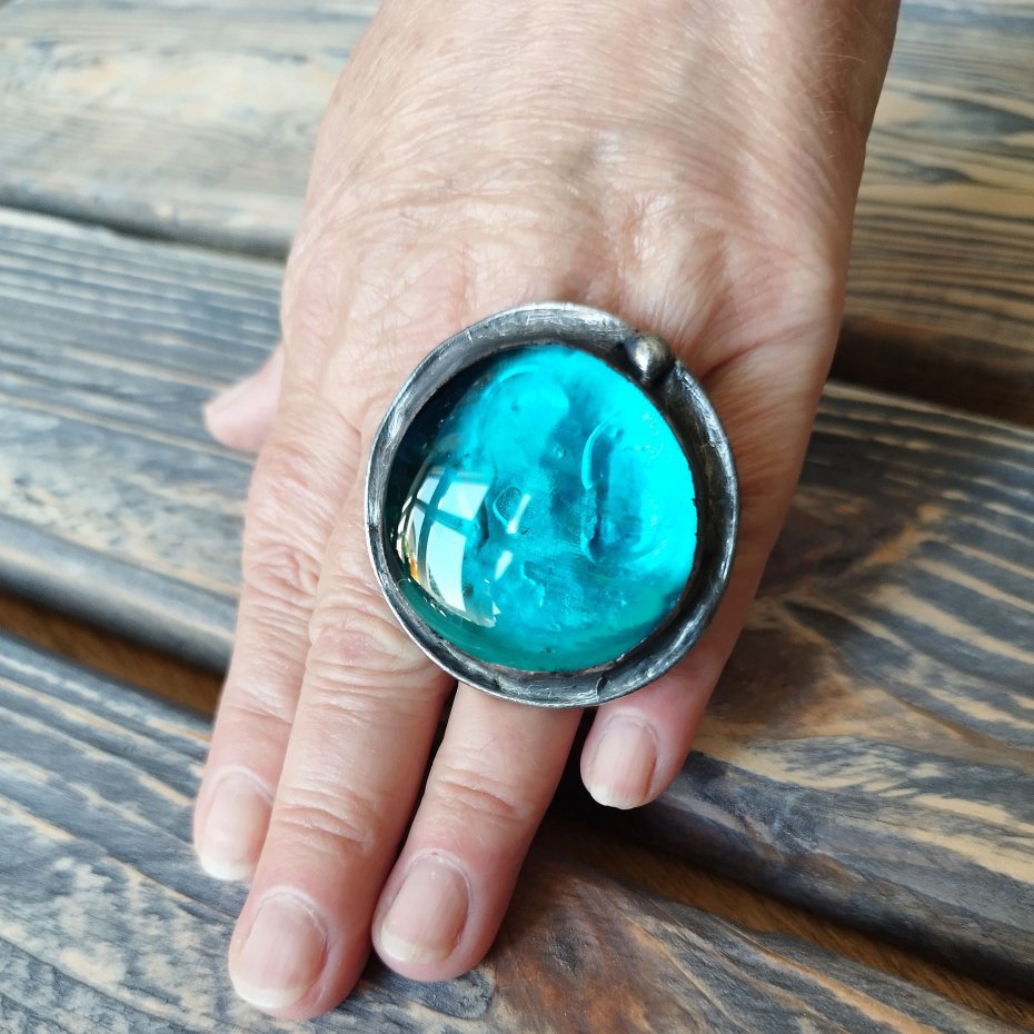 Duży masywny artystyczny pierścionek wykonany ze szklanego morskiego kaboszonu oprawionego stopem cyny na miedzianej bazie. Średnica pierścionka to ok. 4.5 cm , całość stylizowana na stare srebro i ręcznie polerowana. Pierścionek posiada regulowaną obrączkęZapraszam do zakupu.