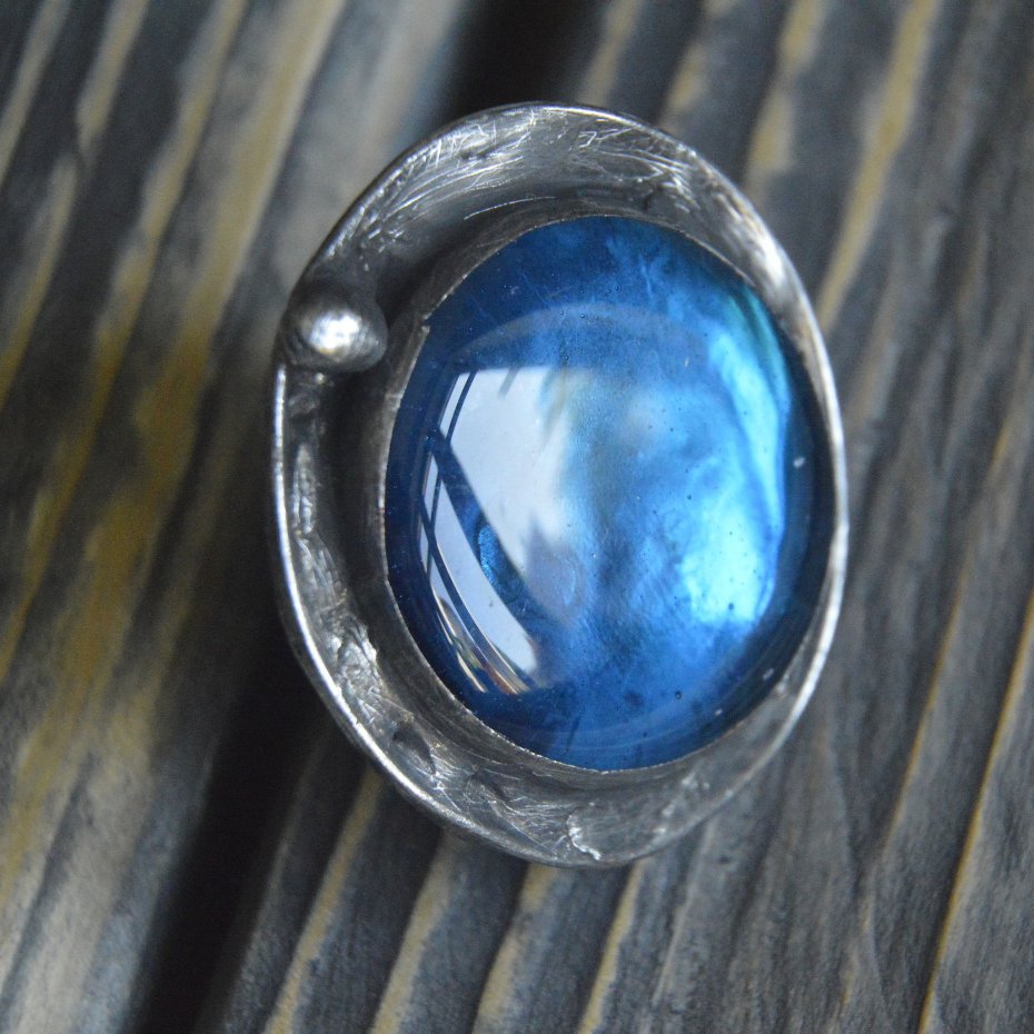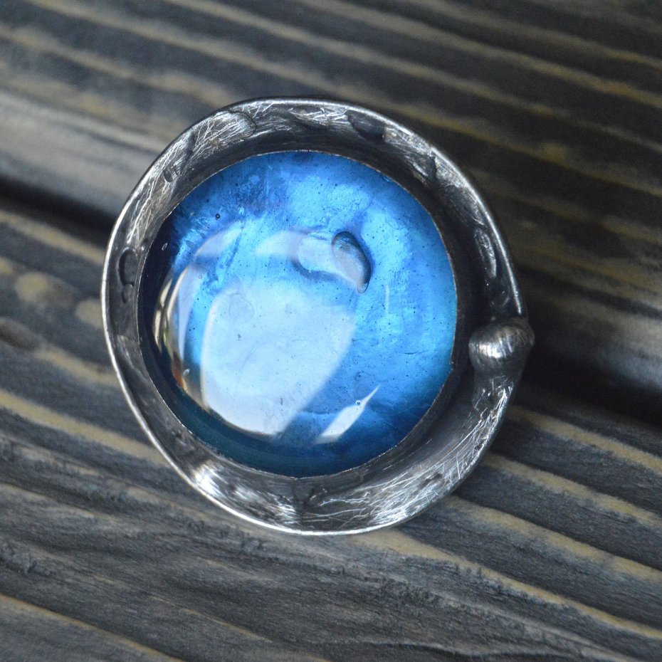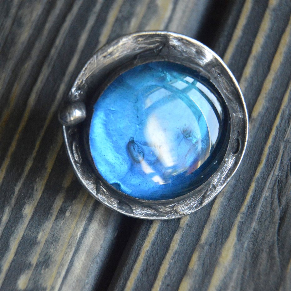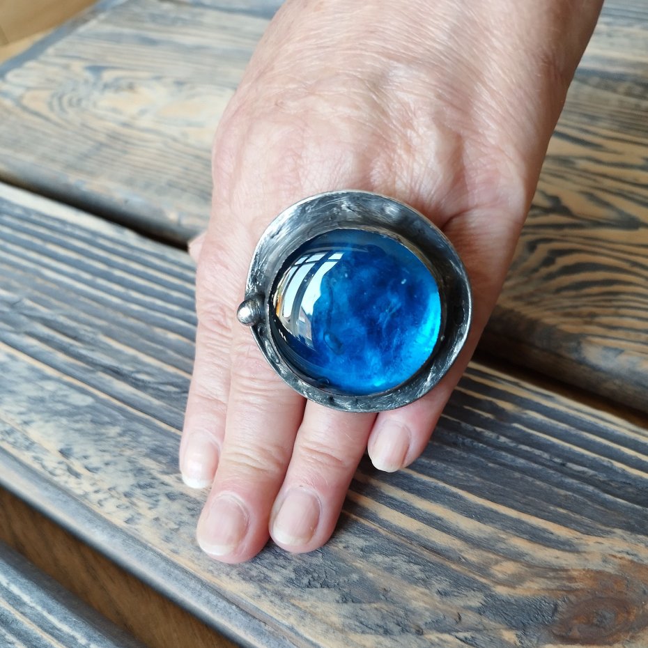 Duży masywny artystyczny pierścionek wykonany ze szklanego turkusowego kaboszonu oprawionego stopem cyny na miedzianej bazie. Średnica pierścionka to ok. 4.5 cm , całość stylizowana na stare srebro i ręcznie polerowana. Pierścionek posiada regulowaną obrączkę Zapraszam do zakupu.
