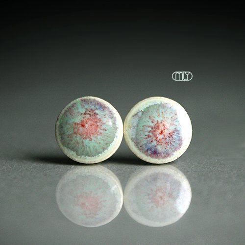 Okrągłe, lekko nieregularne ceramiczne kolczyki w formie sztyftów, ręcznie wykonane z delikatnej jasnobeżowej gliny kamionkowej, jednostronnie szkliwione mieszanką miętowo zielonego i czerwonego błyszczącego szkliwa , na antyalergicznych sztyftach w kolorze srebrnym. Średnica ok. 9mm. Polecam