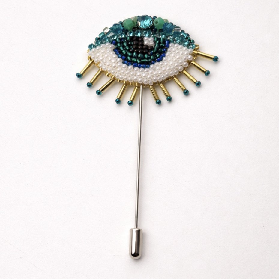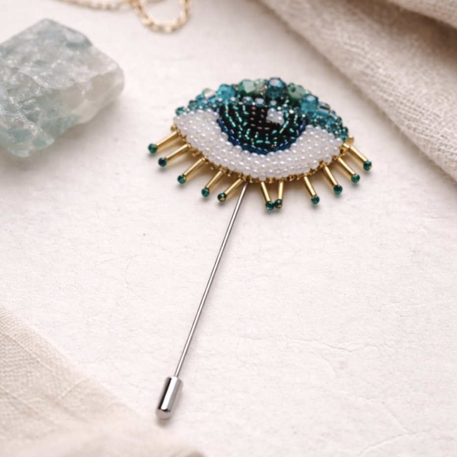 Efektowna broszka na długiej szpilce z motywem oka, wykonana ręcznie techniką haftu koralikowego. To wyjątkowy dodatek inspirowany symboliką oka ochronnego, kojarzonego z intuicją, uważnością i dobrą energią.