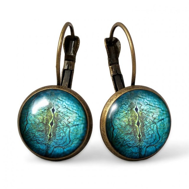 Ręcznie robione kolczyki wiszące z wysokiej jakości grafiką pokrytą wypukłym, powiększającym szkiełkiem.