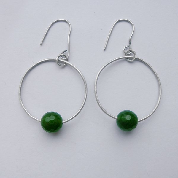 Oryginalność i prostota. OKRĄG - kształt doskonały. Kolekcję cechuje elegancja i prostota jak również ekstrawagancja i indywidualizm. Kolczyki wykonane są ze srebro, jadeit 1cm. Srebro - próby 0,925, zmatowione. Długość kolczyków z biglami - 6 cm. Szerokość ok. 3 cm