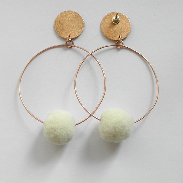 Oryginalność i prostota. OKRĄG - kształt doskonały. Kolekcję cechuje elegancja i prostota jak również ekstrawagancja i indywidualizm. Kolczyki na sztyftach wykonane są z: brąz, pompon ( 20 mm) Sztyft -srebro - próby 0,925, zmatowione . Długość kolczyków - ok. 9 cm , szerokość 6 cm