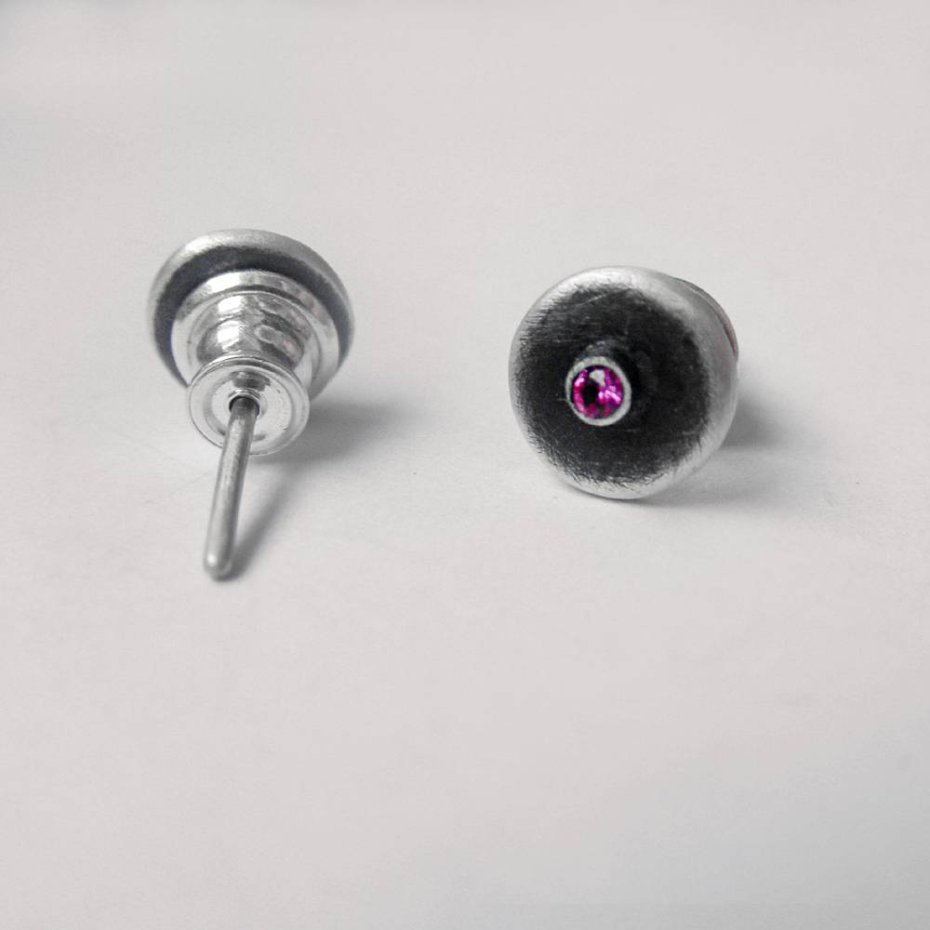 Oryginalność i prostota. OKRĄG - kształt doskonały. Kolekcję cechuje elegancja i prostota jak również ekstrawagancja i indywidualizm. Kolczyki na sztyftach wykonane są ze srebro, rubin. Srebro - próby 0,925, zmatowione, oksydowane. Średnica kolczyka - 0,7 cm