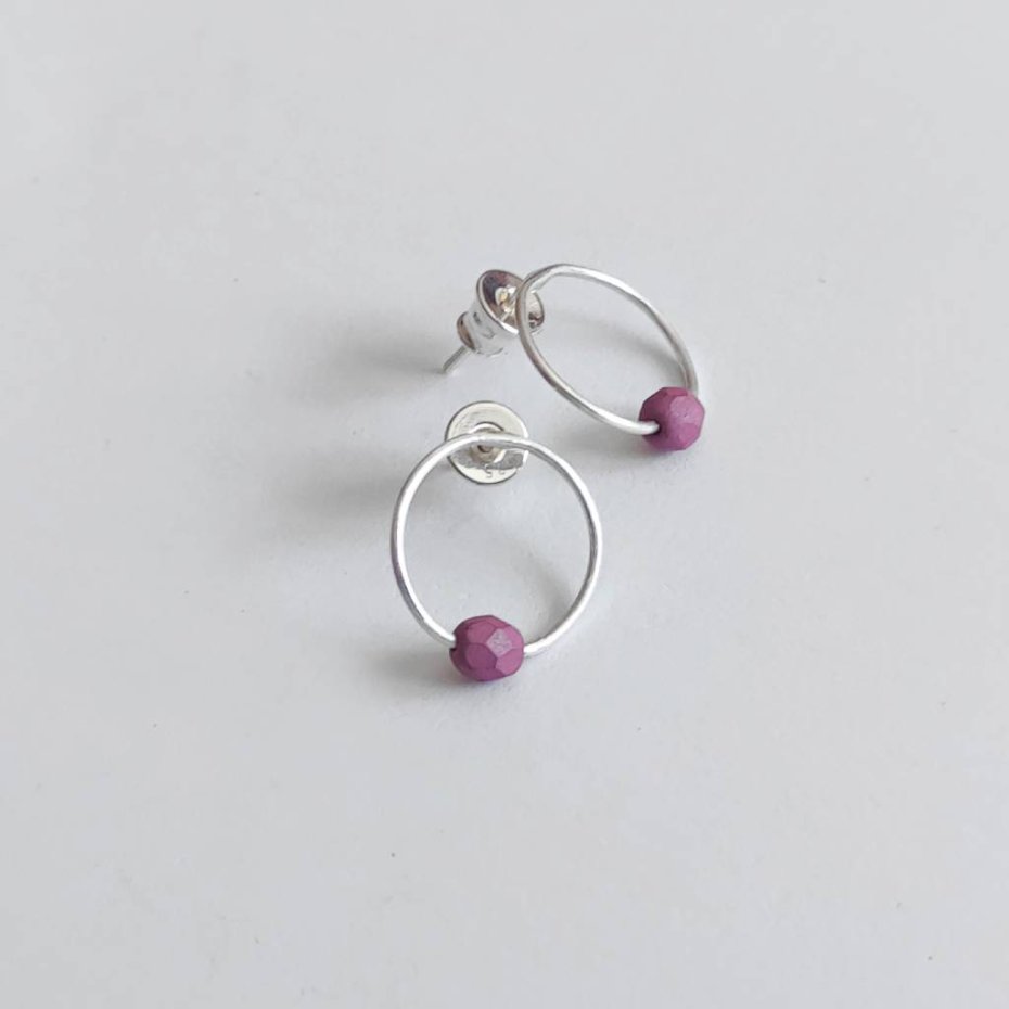 Oryginalność i prostota. OKRĄG – kształt doskonały. Kolekcję cechuje elegancja i prostota jak również ekstrawagancja i indywidualizm. Kolczyki na sztyftach wykonane są z – srebro, koraliki czeskie 0,4 cm Srebro – zmatowione. Szerokość ok. 1,5 cm.