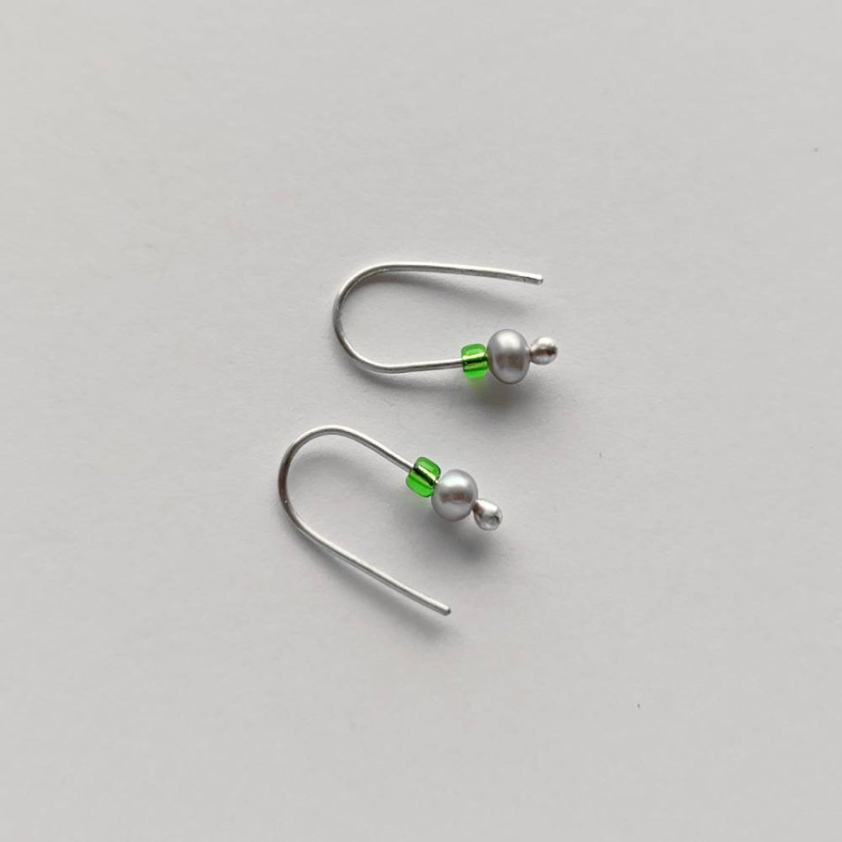 Oryginalność i prostota. OKRĄG - kształt doskonały. Kolekcję cechuje elegancja i prostota jak również ekstrawagancja i indywidualizm. Kolczyki wykonane są z - srebro, Perła słodkowodna srebrna oponka 5x3mm, szklane koraliki. Srebro - zmatowione. Długość ok 1,7 cm.
