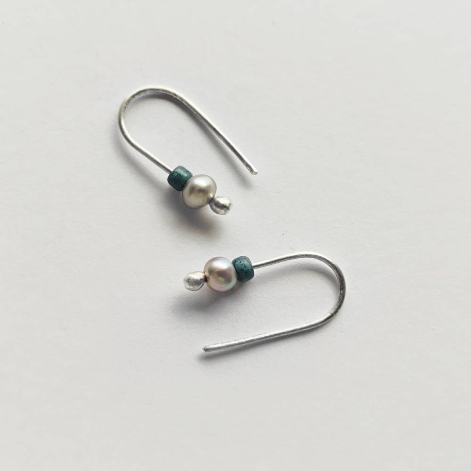 Oryginalność i prostota. OKRĄG - kształt doskonały. Kolekcję cechuje elegancja i prostota jak również ekstrawagancja i indywidualizm. Kolczyki wykonane są z - srebro, Perła słodkowodna srebrna oponka 5x3mm, szklane koraliki. Srebro - zmatowione. Długość ok 1,7 cm.