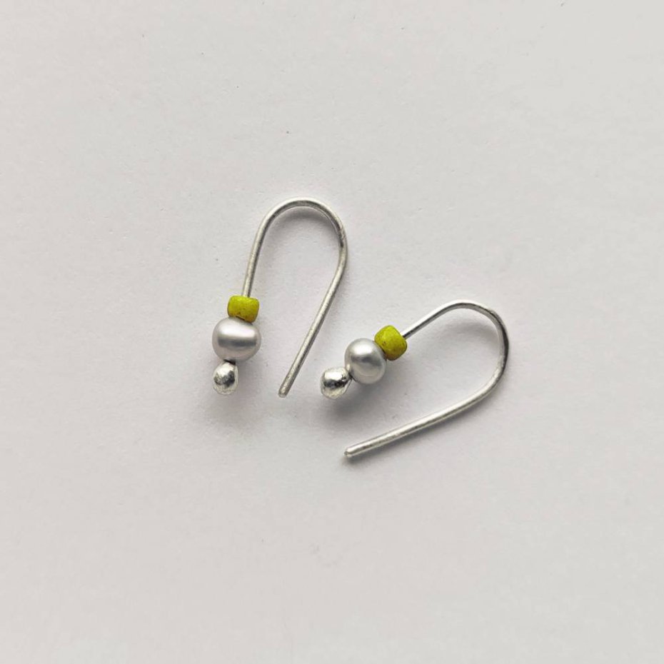 Oryginalność i prostota. OKRĄG - kształt doskonały. Kolekcję cechuje elegancja i prostota jak również ekstrawagancja i indywidualizm. Kolczyki wykonane są z - srebro, Perła słodkowodna srebrna oponka 5x3mm, szklane koraliki. Srebro - zmatowione. Długość ok 1,7 cm.