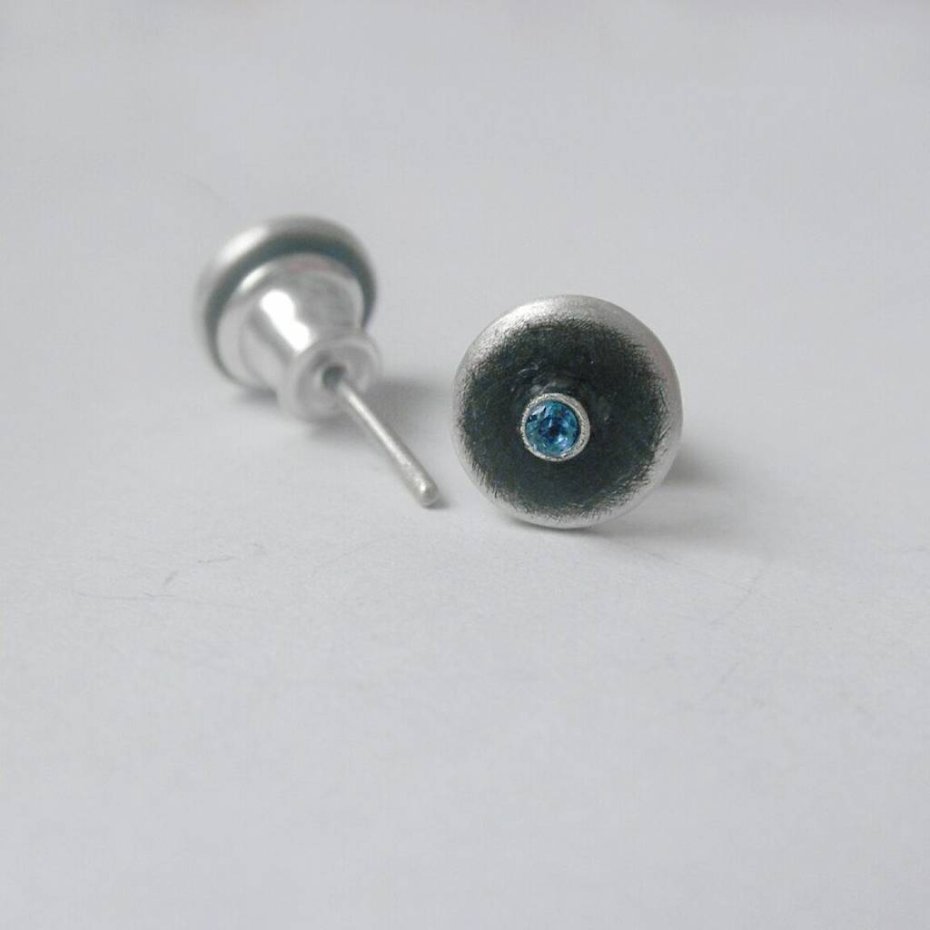 Oryginalność i prostota. OKRĄG - kształt doskonały. Kolekcję cechuje elegancja i prostota jak również ekstrawagancja i indywidualizm. Kolczyki na sztyftach wykonane są ze srebro, akwamaryn. Srebro - próby 0,925, zmatowione, oksydowane. Średnica kolczyka - 0,7 cm