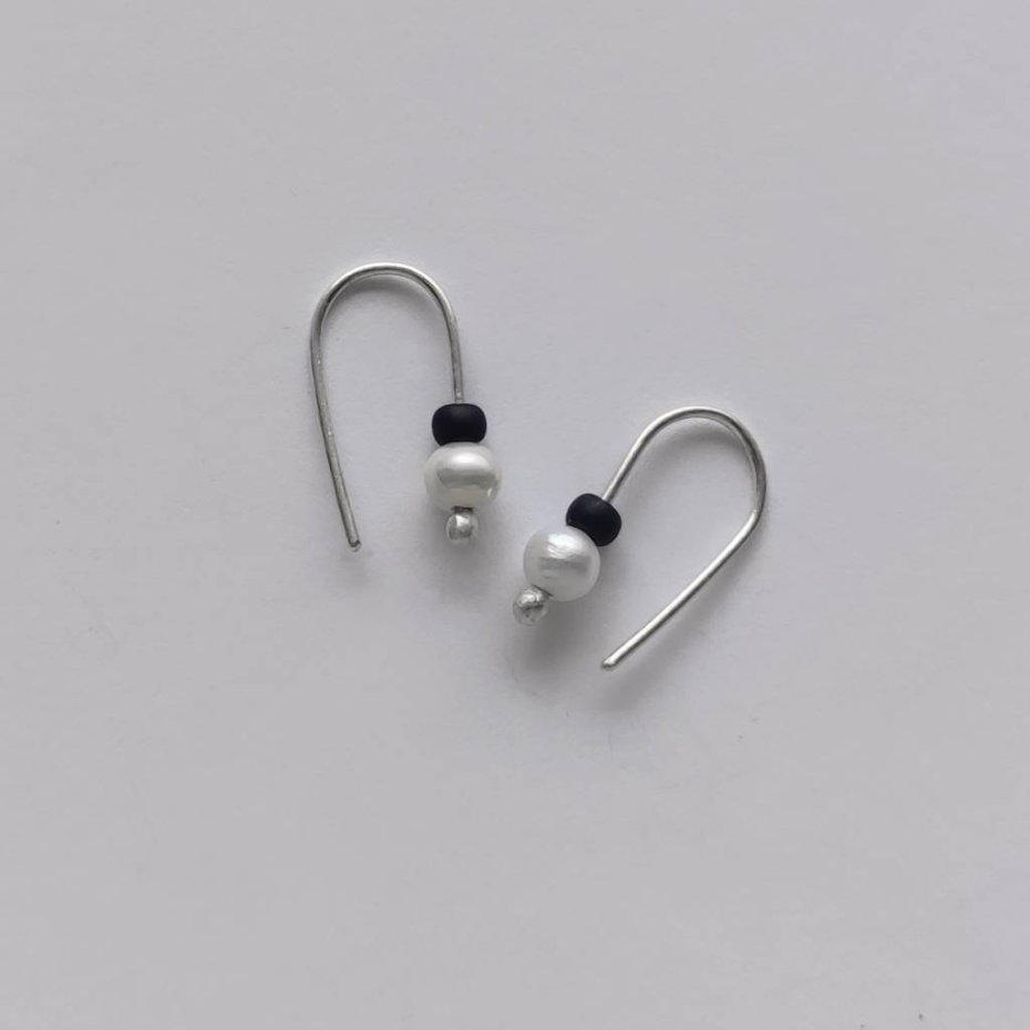 Oryginalność i prostota. OKRĄG – kształt doskonały. Kolekcję cechuje elegancja i prostota jak również ekstrawagancja i indywidualizm. Kolczyki wykonane są z – srebro, Perła słodkowodna srebrna oponka 4 mm, koraliki szklane. Srebro – zmatowione. Długość ok. 1,7 cm.