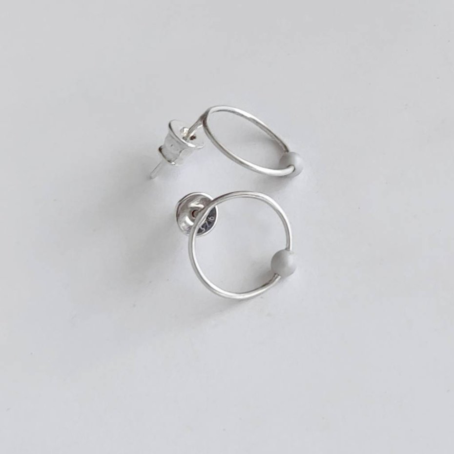 Oryginalność i prostota. OKRĄG – kształt doskonały. Kolekcję cechuje elegancja i prostota jak również ekstrawagancja i indywidualizm. Kolczyki na sztyftach wykonane są z – srebro, koraliki czeskie 0,4 cm Srebro – zmatowione. Szerokość ok. 1,5 cm.