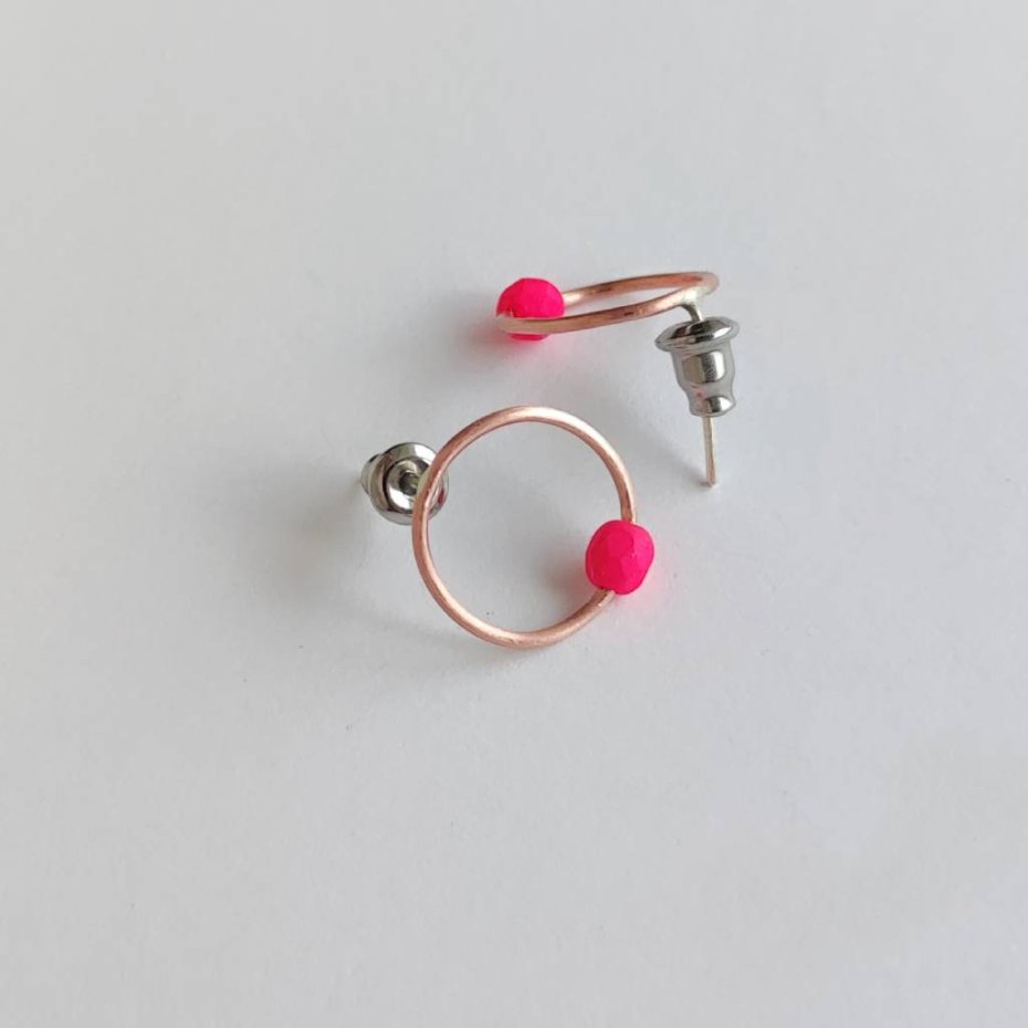 Oryginalność i prostota. OKRĄG - kształt doskonały. Kolekcję cechuje elegancja i prostota jak również ekstrawagancja i indywidualizm. Kolczyki na sztyftach wykonane są z - srebro, miedź, koraliki czeskie - 0,4 cm Srebro - zmatowione. Szerokość ok. 1,2 cm.