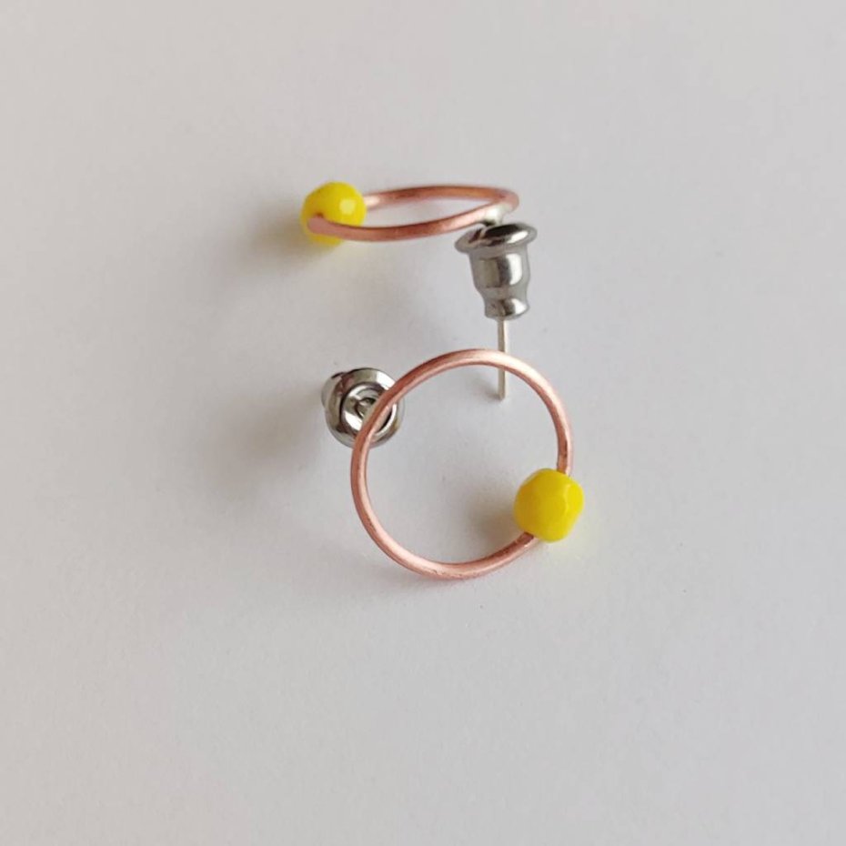 Oryginalność i prostota. OKRĄG - kształt doskonały. Kolekcję cechuje elegancja i prostota jak również ekstrawagancja i indywidualizm. Kolczyki na sztyftach wykonane są z - srebro, miedź, koraliki czeskie - 0,4 cm Srebro - zmatowione. Szerokość ok. 1,2 cm.