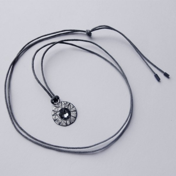 Wisior wykonany jest ze srebra, ozdobny sznurek kryształ SWAROVSKI ELEMENTS (Wymiary: średnica 7,0 mm ) Srebro - próby 0,925, mocno fakturowane, oksydowane.Średnica zawieszki ok. 1,5 cm Waga - ok. 5g Długość sznurka: ok. 85 cm ( istnieje możliwość regulacji długości . Na życzenie istnieje możliwość zmiany koloru sznurka