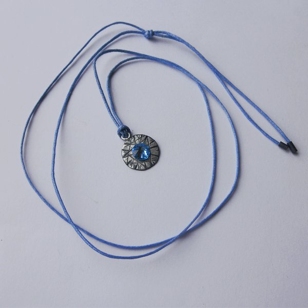 Wisior wykonany jest ze srebra, ozdobny sznurek kryształ SWAROVSKI ELEMENTS (Wymiary: średnica 7,0 mm ) Srebro - próby 0,925, mocno fakturowane, oksydowane.Średnica zawieszki ok. 1,5 cm Waga - ok. 5g Długość sznurka: ok. 85 cm ( istnieje możliwość regulacji długości . Na życzenie istnieje możliwość zmiany koloru sznurka