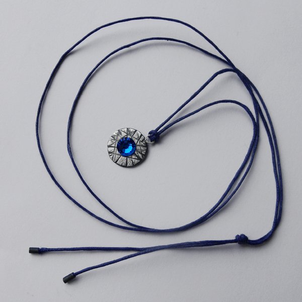 Wisior wykonany jest ze srebra, ozdobny sznurek kryształ SWAROVSKI ELEMENTS (Wymiary: średnica 7,0 mm ) Srebro - próby 0,925, mocno fakturowane, oksydowane.Średnica zawieszki ok. 1,5 cm Waga - ok. 5g Długość sznurka: ok. 85 cm ( istnieje możliwość regulacji długości . Na życzenie istnieje możliwość zmiany koloru sznurka