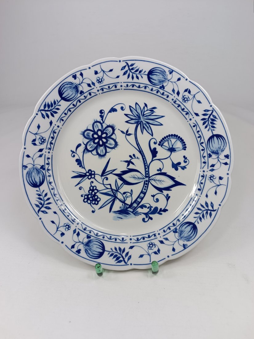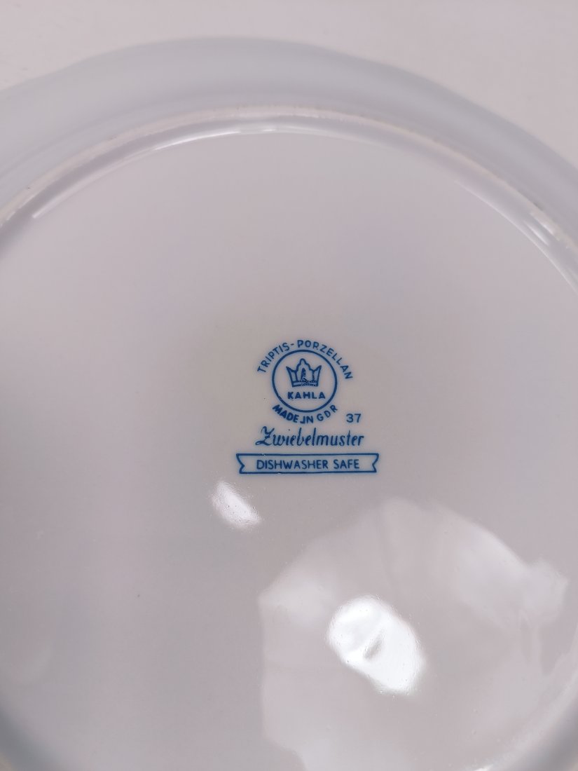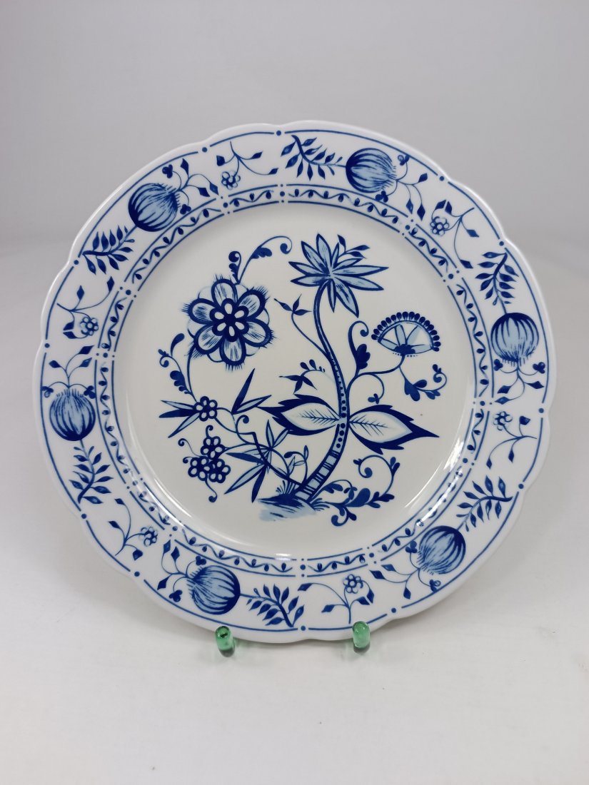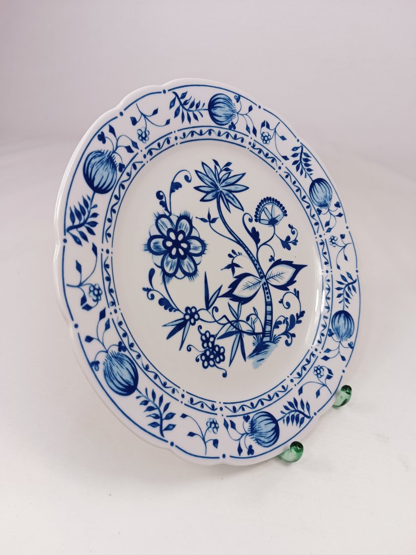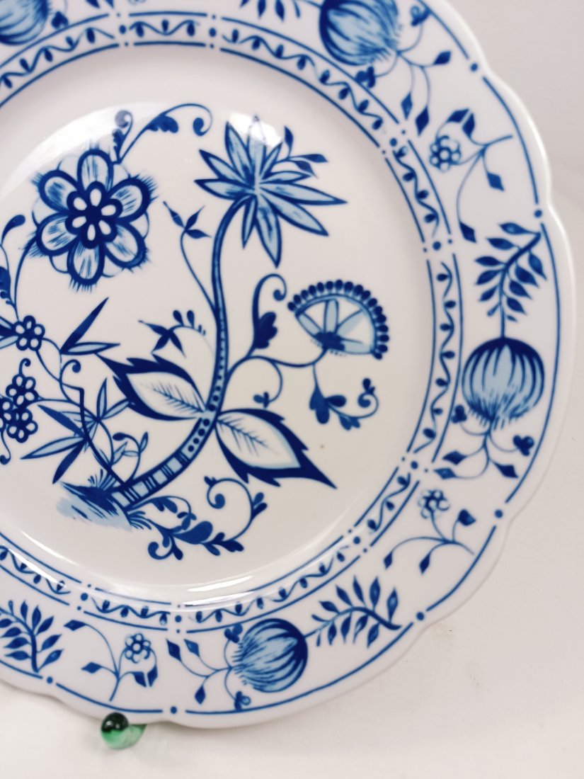 Okrągła patera ze wzorem cebulowym, sygnowana 'Kahla'. Stan zachowania bardzo dobry, bez uszkodzeń. Średnica 26,5 cm.