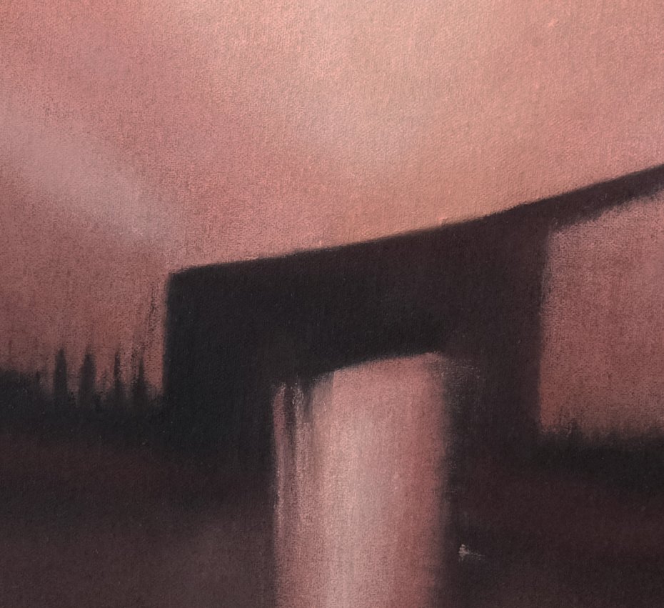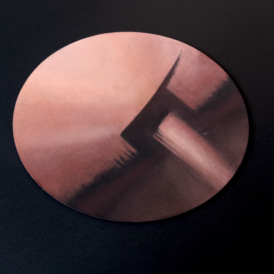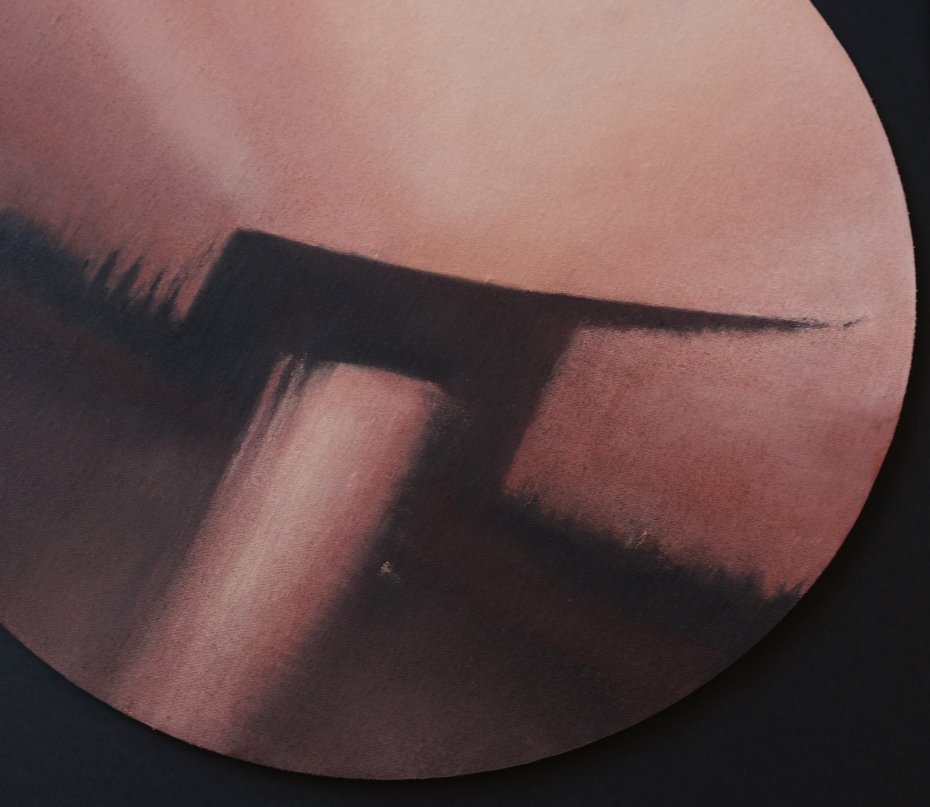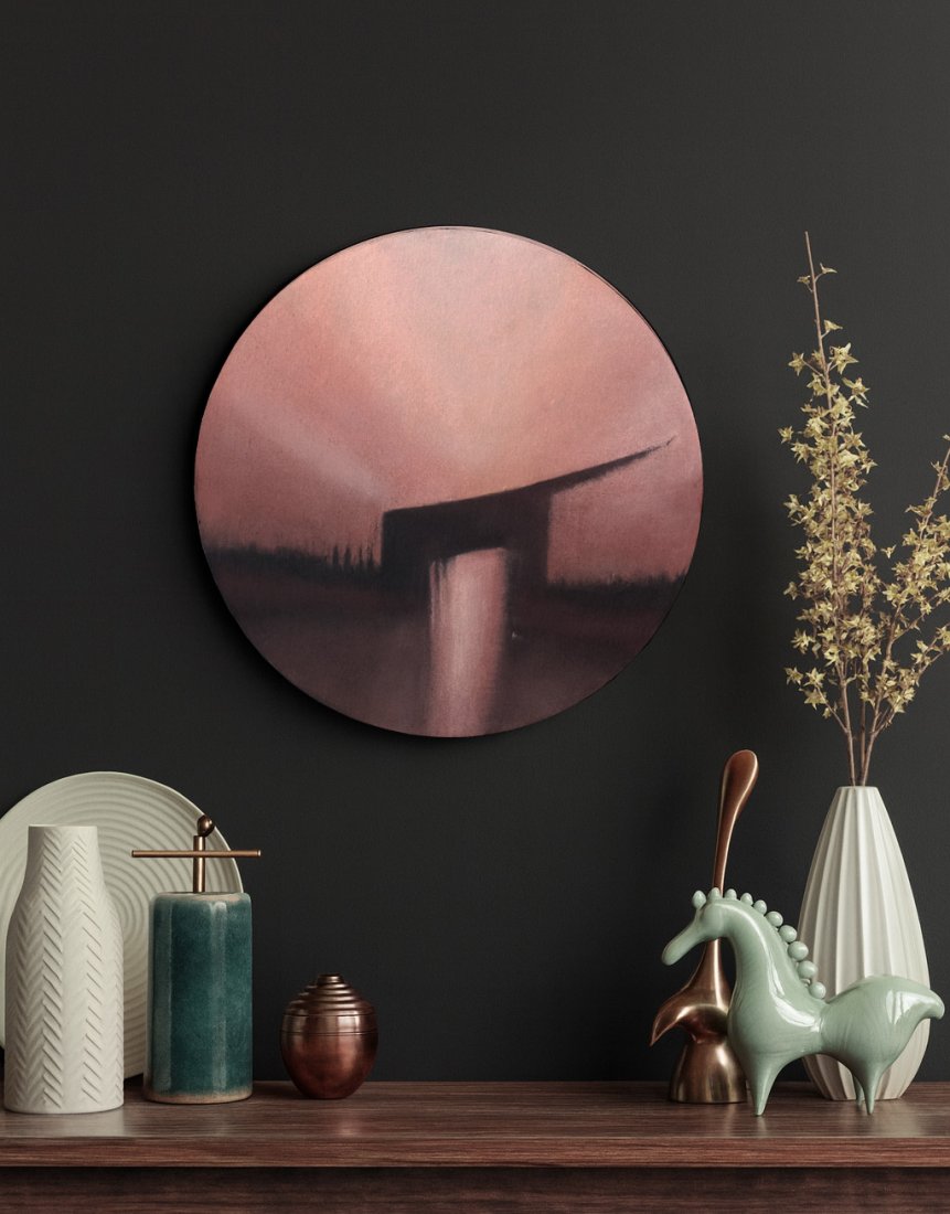 Kompozycja utrzymana jest w ciepłych odcieniach łososiowego, brązu, przygaszonego różu oraz głębokich ciemnych akcentów, tworzących nastrojową, miękko rozmytą przestrzeń. Subtelne przejścia tonalne i okrągły format nadają pracy wyjątkową lekkość i współczesny charakter.