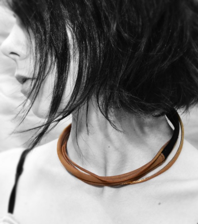 Naszyjnik wykonany został z jasnej brązowej oraz czarnej ekoskóry oraz brązowego, złoconego rzemyka. Z metalowymi elementami przy zapięciu.