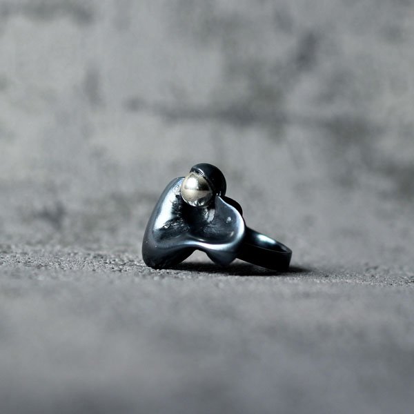 Piękny, zjawiskowy, regulowany pierścionek kwiatowy czarny storczyk wykonany z oksydowanego srebra próby 925. Wewnątrz storczyka znajduje się srebrna kula, która przełamuje czarną powierzchnię pierścionka. Jego powierzchnia pokryta jest czarną oksydą. Całość została wypolerowana i zaimpregnowana.