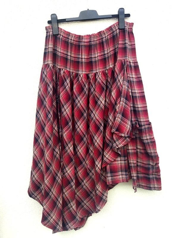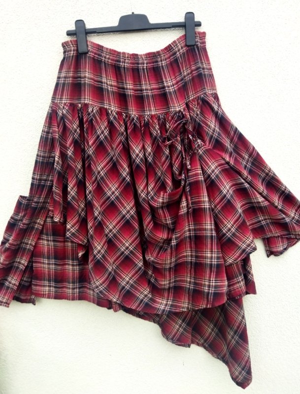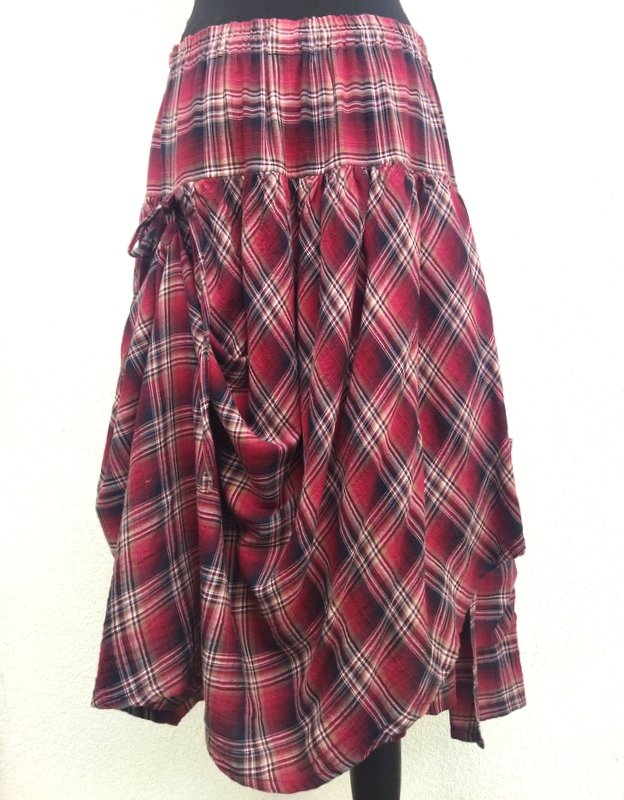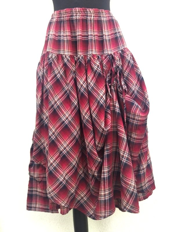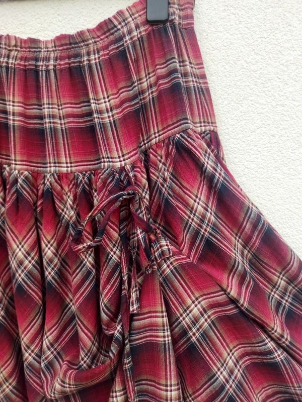 Świetna spódnica z organicznej bawełny z wzorem w kratkę w kolorach burgundu, złamanej bieli, bieli i czerni. Marszczona z wszyta gumą w pasie. Dwuwarstwowa z asymetryczną nakładką doszywaną od karczka z możliwością podwiązywania na troczki z przodu i z tyłu co umożliwia noszenie jej na kilka sposobów na kilka sposobów.