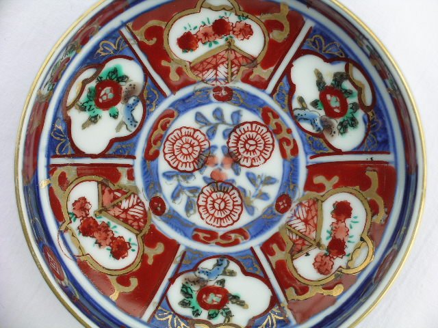 Ręcznie malowany talerzyk-paterka w ciekawym kształcie. Oryginalnie japoński, sygnowany, na bogato mandalicznie zdobiony wg tradycyjnego wzoru Imari. Głębia kolorów, błyszcząco-satynowe wykończenie, złocenia. Stópka 6; góra 10; wys. niecałe 3 cm. Stan zachowania bardzo dobry. Dawny wyrób.