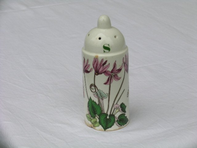 Porcelanowa solniczka od Portmeirion. Naprawdę stara edycja, tylko numerycznie sygnowana, z cyklamenowym wzorem wg Susan Ellis. Pęknięcie z tyłu wzdłuż. Dół także nosi ślady czasu i lubego użytkowania - zmiękczony ubytek rantu oraz zaciemnienia szkliwa, ale całość nadal użytkowa i nawet bardziej przez te cechy intrygująca :) Od spodu zatyczka plastikowa. 4,5 x 11 cm.