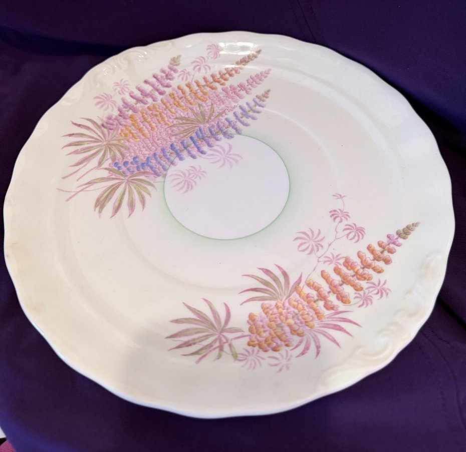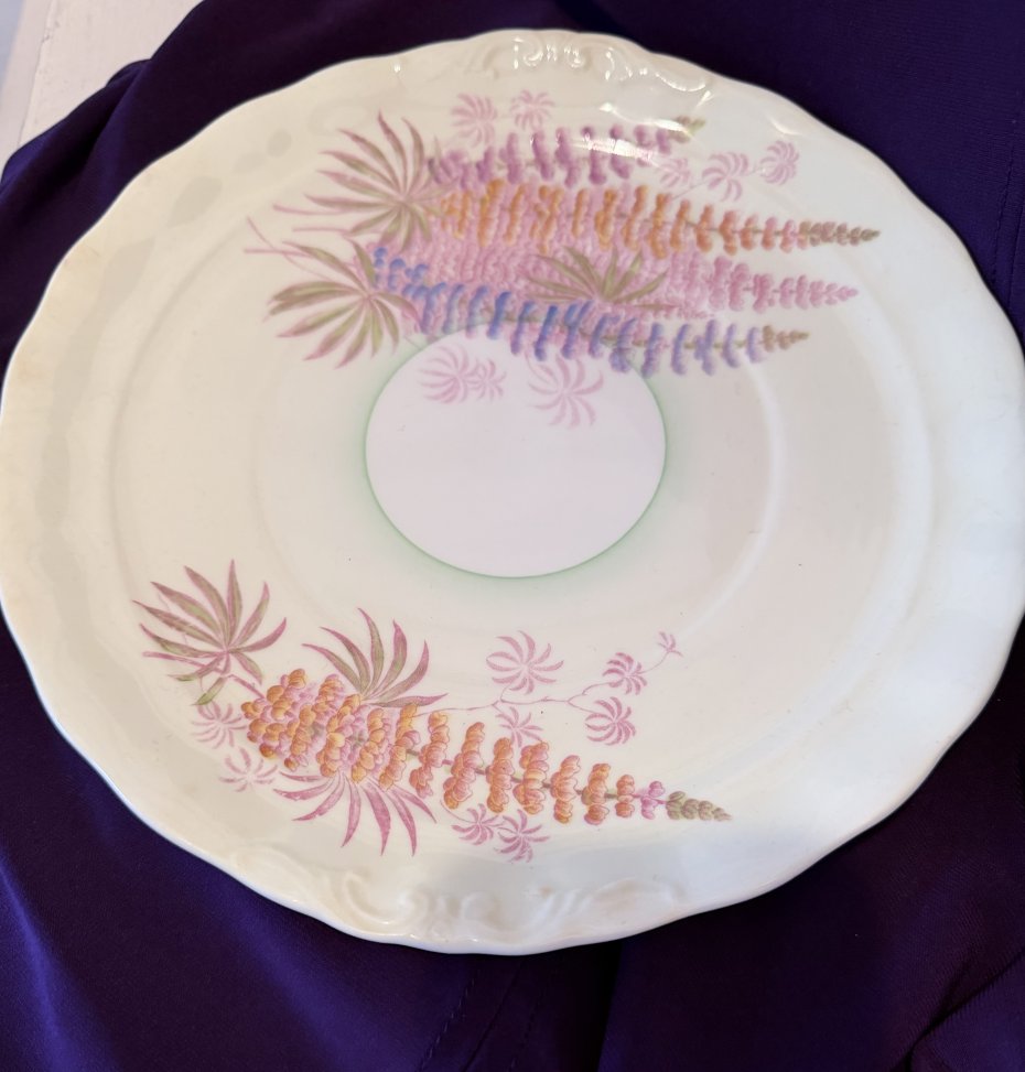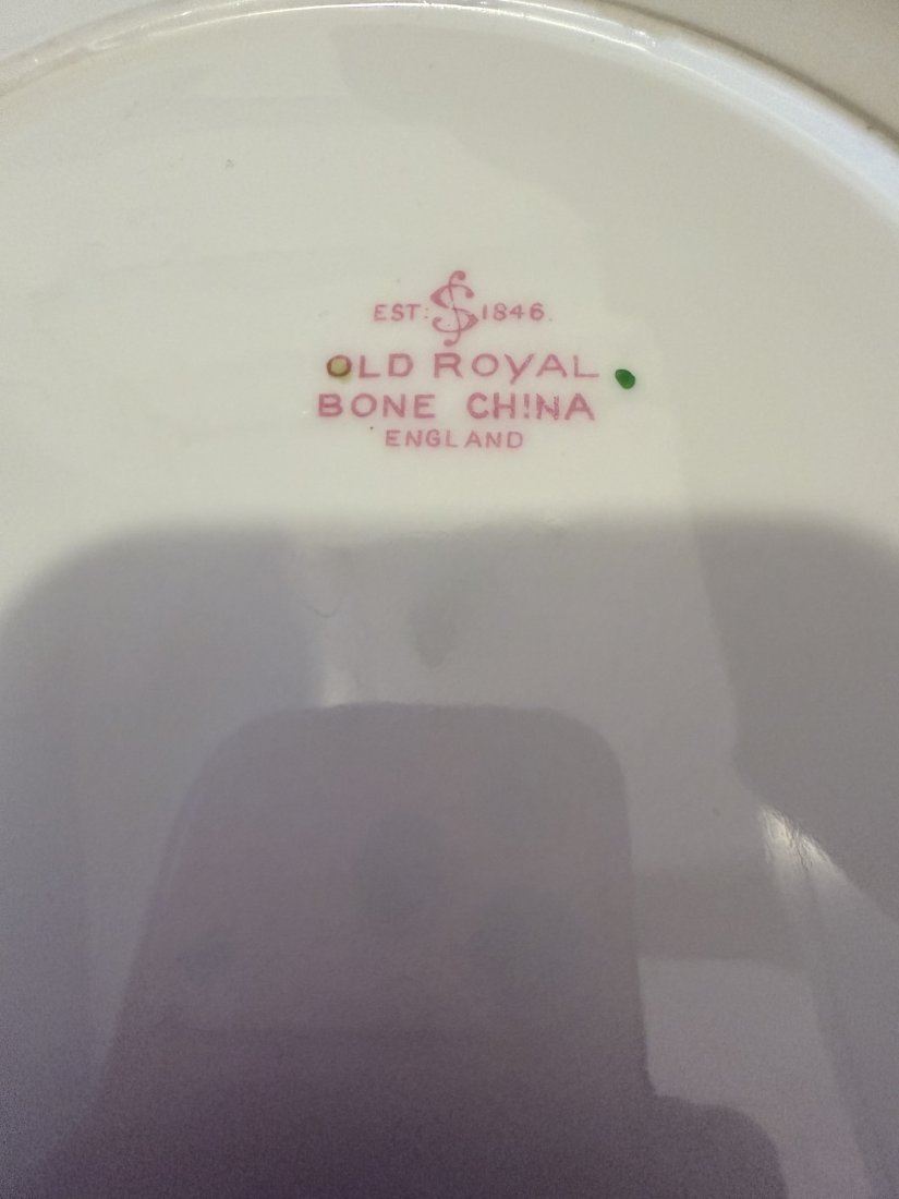 Talerz deserowy , w pastelowych kolorach pięknie zdobiony , średnica 22 cm . Antyk wyprodukowany przez Old Royal China firma działa od 1846 r