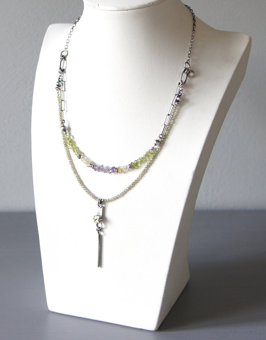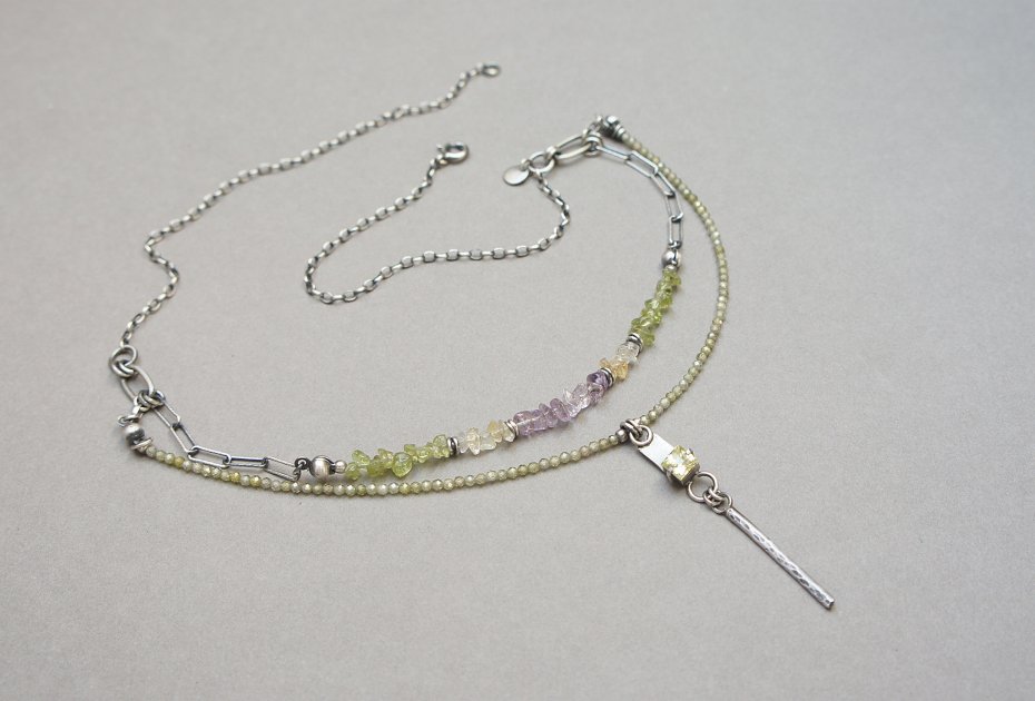 Krótki naszyjnik wykonany od podstaw ze srebra [pr. 925] w połączeniu z fasetowanymi cyrkoniami [2mm], cytrynami ametystami i perydotami w kształcie nieforemnych bryłek oraz cyrkonią w kasetce[5mm x5mm]. Srebro oksydowane i przetarte. Całkowita długość krótszego łańcuszka 48,5cm. Biżuteria ozdobnie zapakowana.