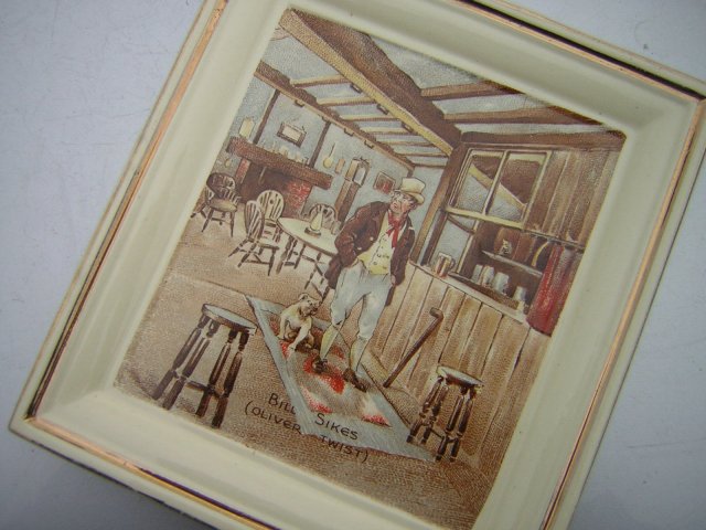 Bardzo oryginalna rzecz, rzadko spotykana. Obraz na porcelanie. ..ale...talerzykowa prostokątna, więc użytkowa forma. Sygnowany NEW HALL HANLEY ENGLAND. Porcelana solidna, mocna w kolorze kości słoniowej, złocenia. Obrazek w typowo angielskiej stylistyce i kolorach. Bill Sikes / OLIVER TWIST / . Idała rzecz do klasycznego wnętrza w stylu angielskim. Z tyłu cztery dziurki do powieszenia. Wykończenie satynowo - błyszcząco - matowe. Rarytas dekoratorski nie tylko angielskiego Pubu ;)