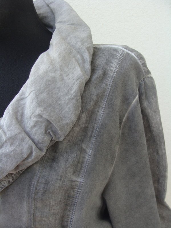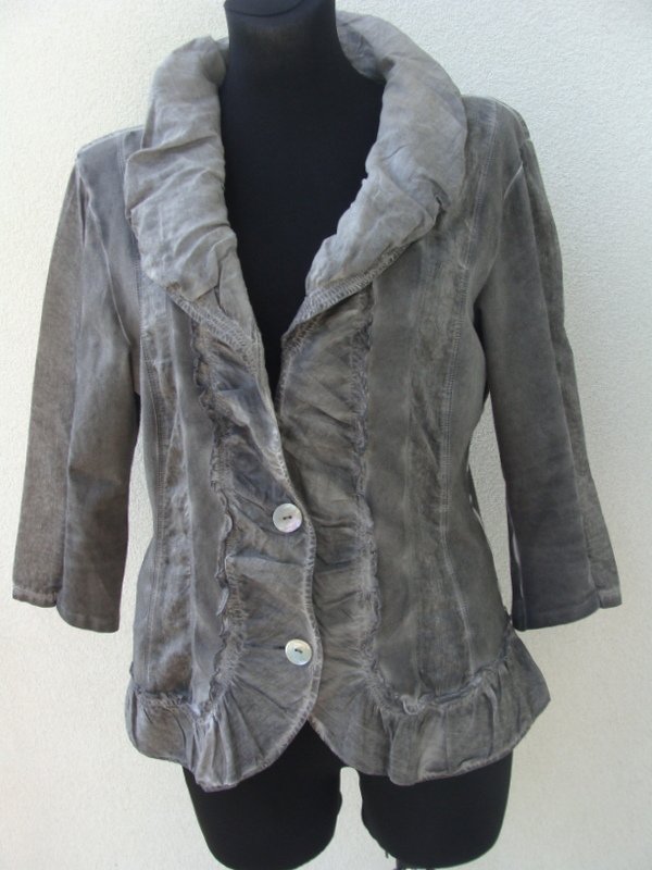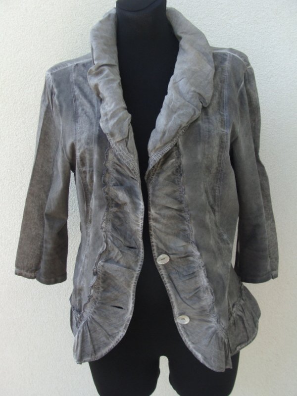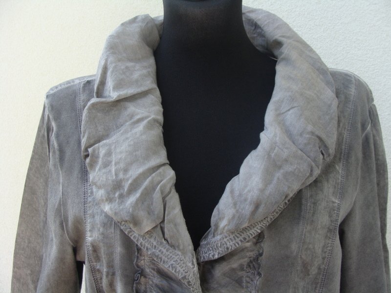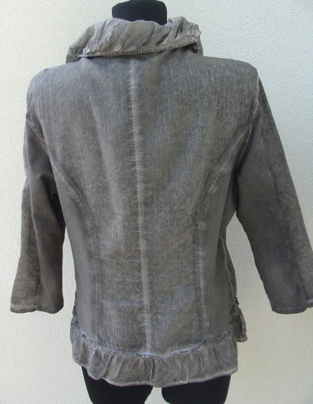 Letnia zgrabna marynarka z łączonych dekatyzowanych materiałów w szarym kolorze; dekatyzowanej tkaniny dzianinowej i cienkiej tkaniny bawełnianej. Taliowana z drapowanym kołnierzem , obszyta falbanką. Zapinana na dwa guziki z macicy perłowej. Bez podszewki