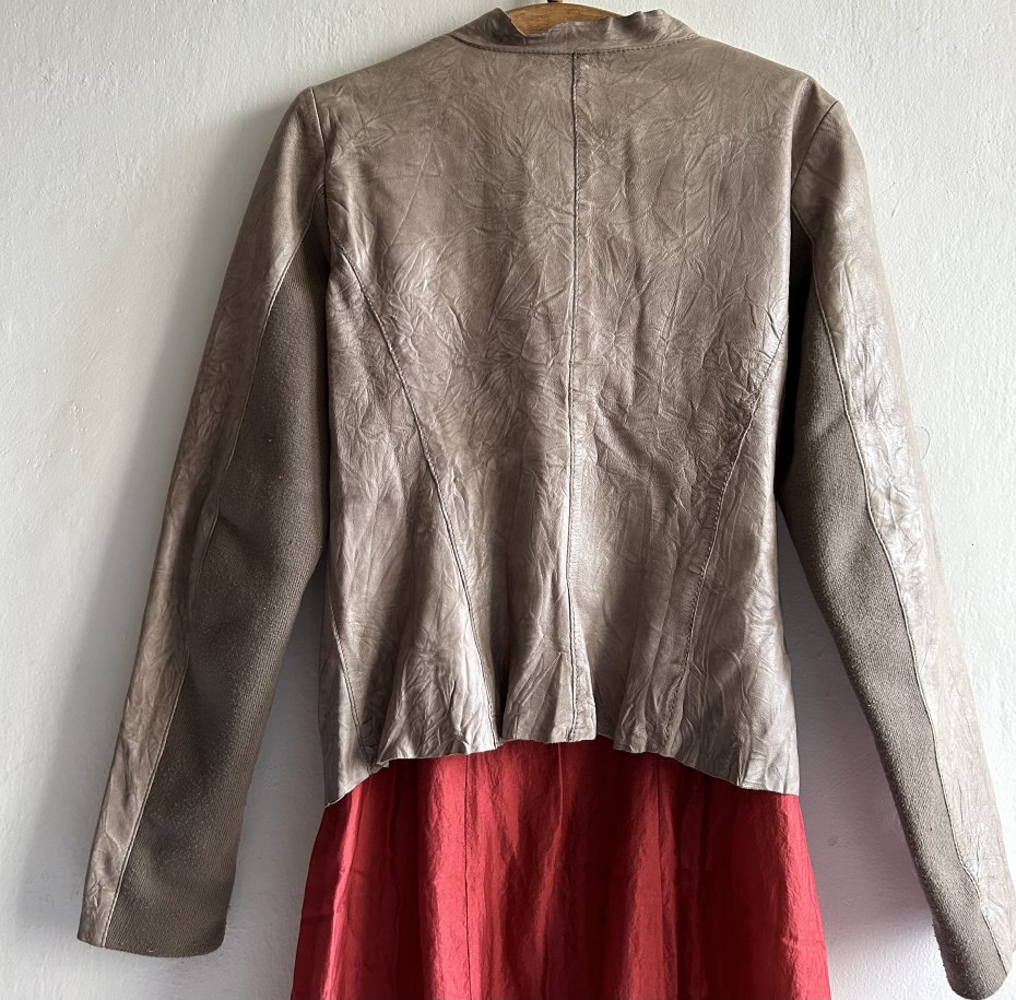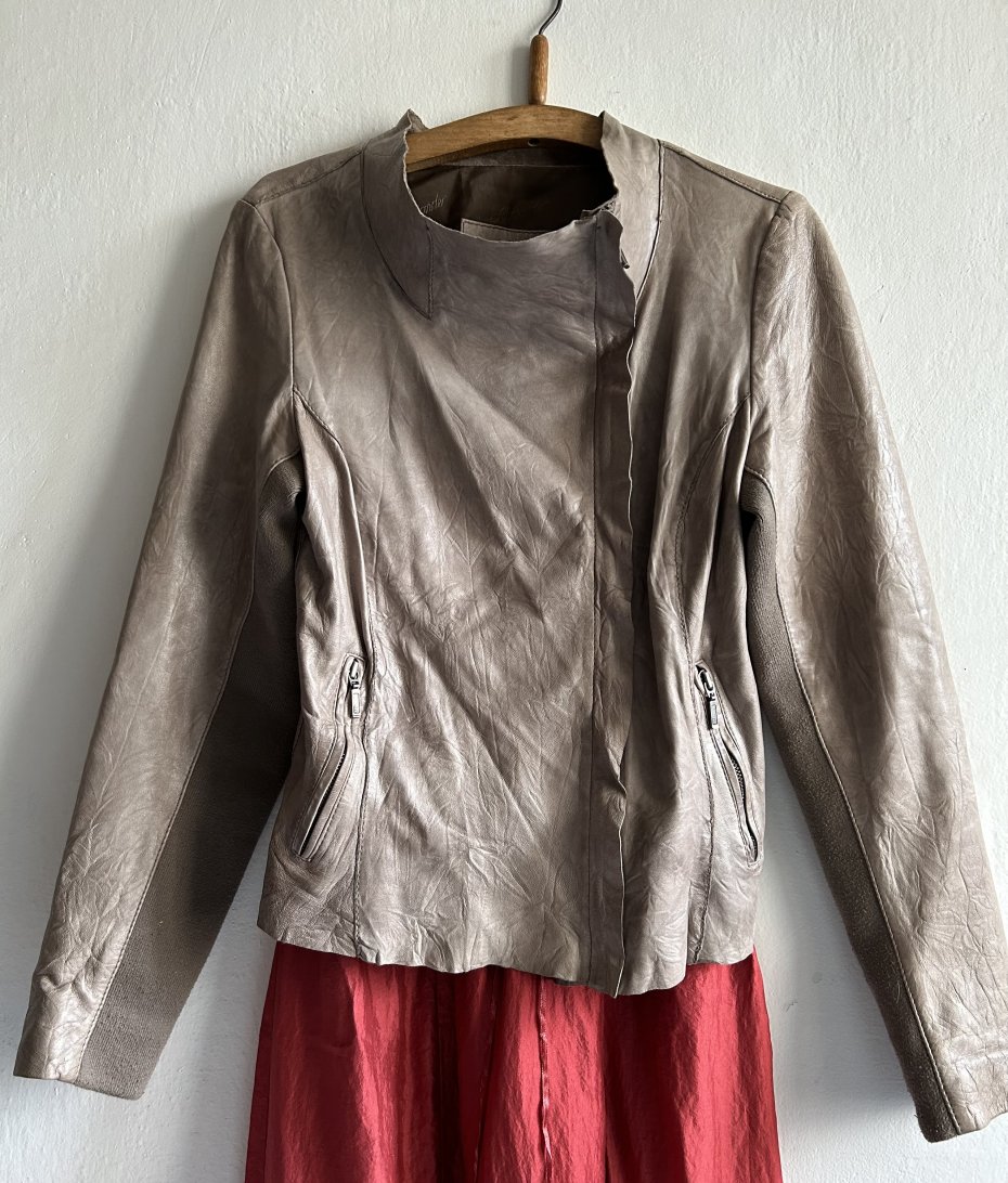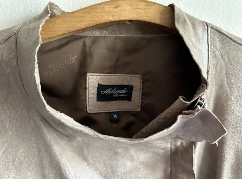 Vintage rasowy , na rynku polskim unikatowy . Fantastyczną kurtka skórzana . Jakościowa cieniutka, miękko układająca się skóra lekko gnieciona w niespotykanej rozbielonej oliwkowej barwie . Ciekawy lekko dopasowany fason . Asymetryczny przód na suwak . Kieszenie również z suwakami - duże wygodne Rękawy