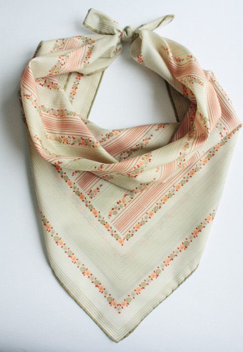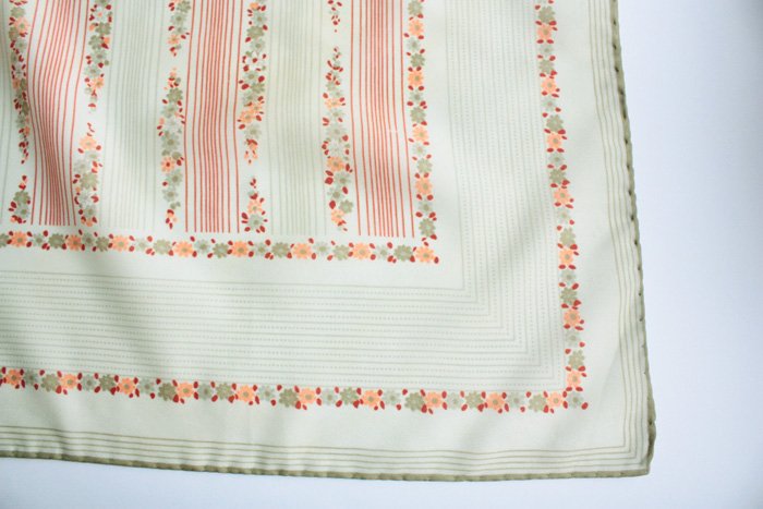 Subtelna chusta z kwiatowymi motywami i oliwkowymi akcentami. Rolowane brzegi. Materiał oceniam na poliester.