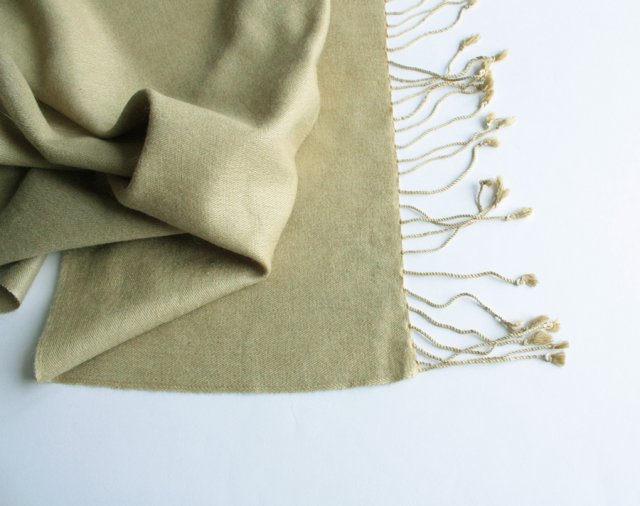 Oliwkowy szal w wysokiej jakości materiału, który oceniam na kaszmir.