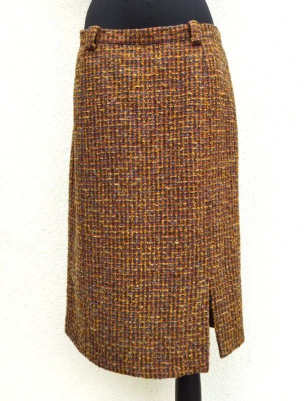 Ciepła ołówkowa spódnica z dobrej jakości wełnianej tkaniny z faktura boucle w kolorystyce czekoladowego brązu, dwóch odcieni beżu, rudości , zgaszonej żółci i dwóch odcieni błękitu. Na usztywnionym pasku w talii z naszywanymi szlufkami, z rozcięciem z dołu z jednego boku na linii kolana. zapinana z tyłu na zamek. Na eleganckiej podszewce