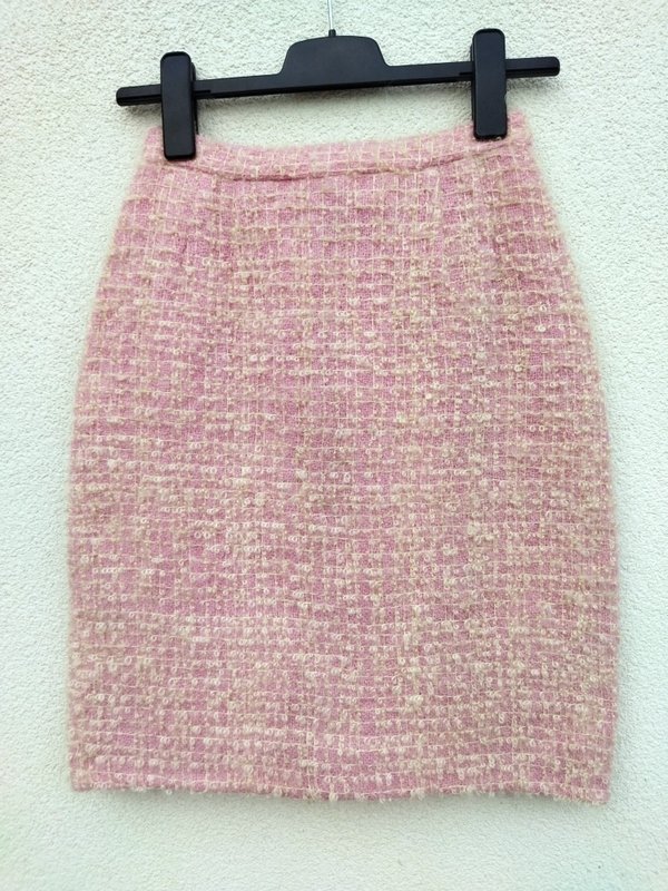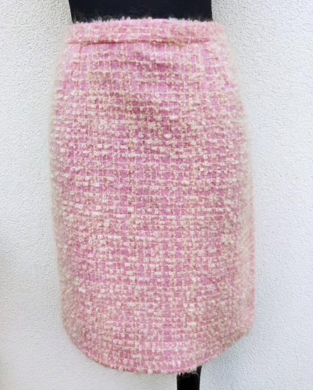 Ciepła ołówkowa spódniczka z wełnianej tkaniny w różowym kolorze przetykanej włóczką z fakturą boucle w kolorze mlecznej bieli. Na pasku w talii,. zapinana z tyłu na zamek . Na bawełnianej podszewce.